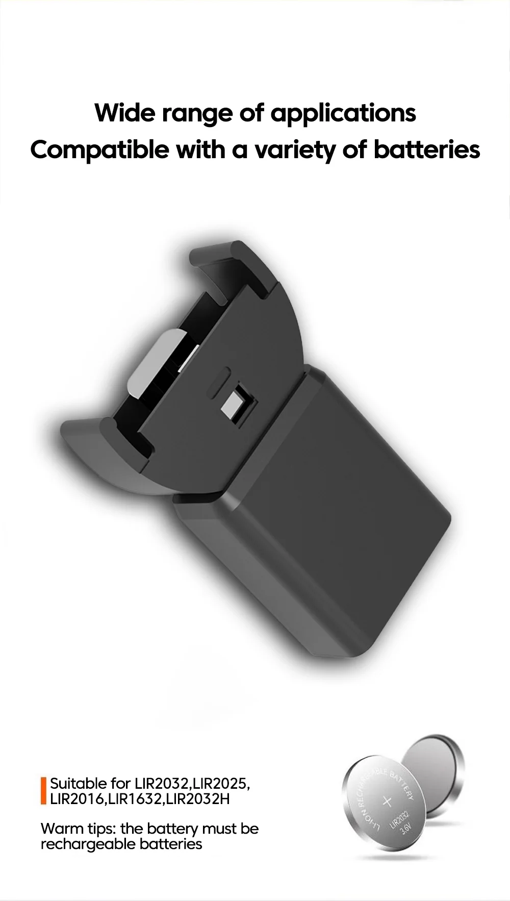 Modelos de batería de botón recargable adecuados: LIR2032, LIR1632, LIR2025, LIR2016, LIR2032H (alta capacidad)
