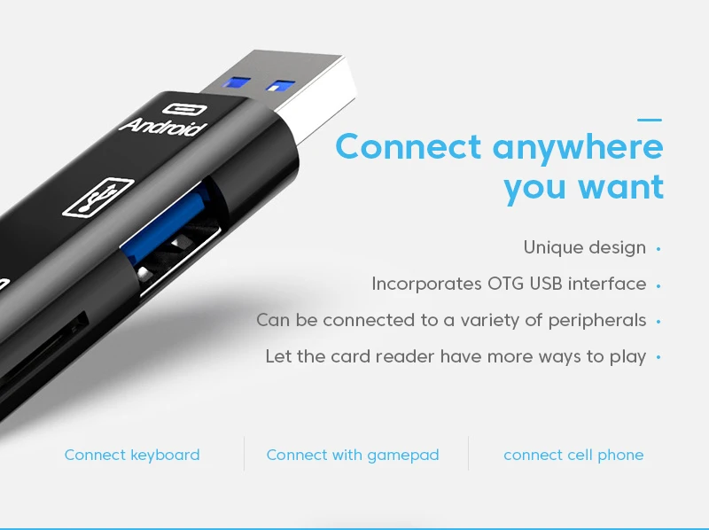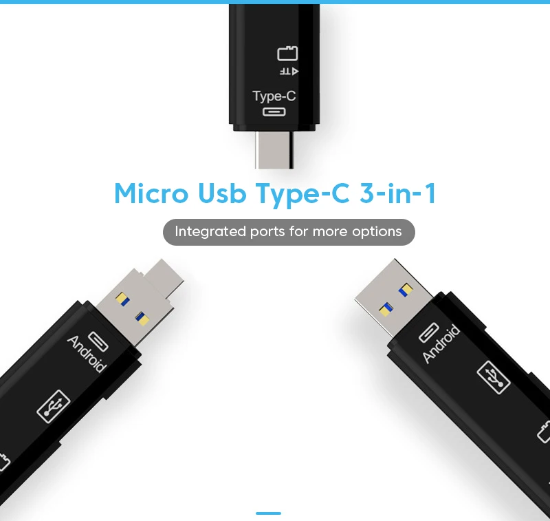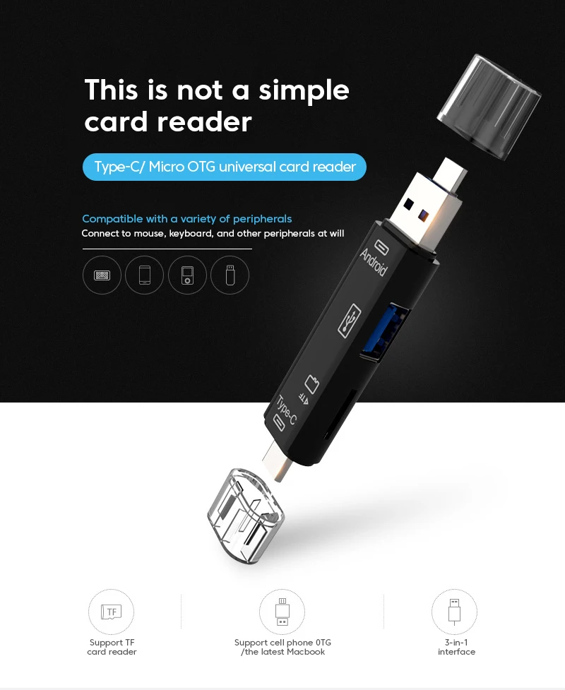 Product features: USB2.0 male+MICRO male+Type-C male, high-speed reading TF memory card, USB female interface, external keyboard, mouse, USB disk, U shield, game handle and other USB devices.