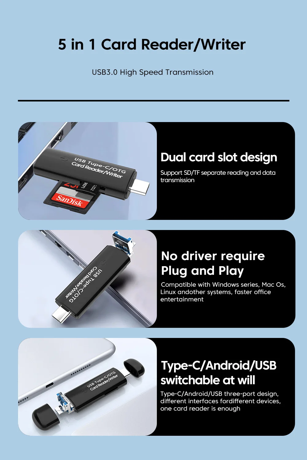 Comprar Elough-lector de tarjetas USB 3,0 a SD, adaptador de tarjeta de memoria Micro SD TF para PC, portátil, accesorios, lector de tarjetas inteligente múltiple