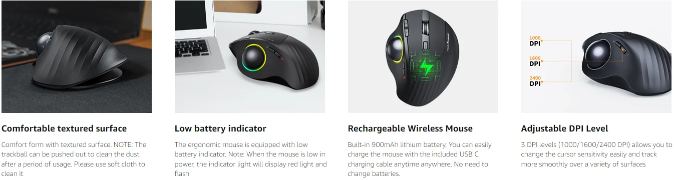 RECHARGEABLE & ADJUSTABLE DPI: The Bluetooth RGB Trackball Mouse built-in 900mAh lithium battery. No need to change batteries. It can last 1 month per one full recharge with the lights off. Please remember to turn it off if you do not use it for a long time. 3 DPI levels (1000/1600/2400 DPI) allows you to change the cursor sensitivity easily and track more smoothly over a variety of surfaces