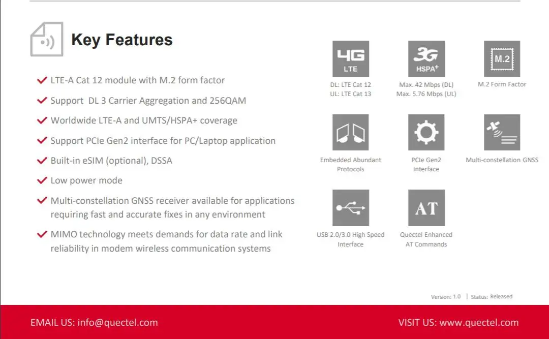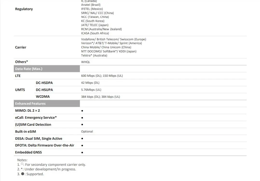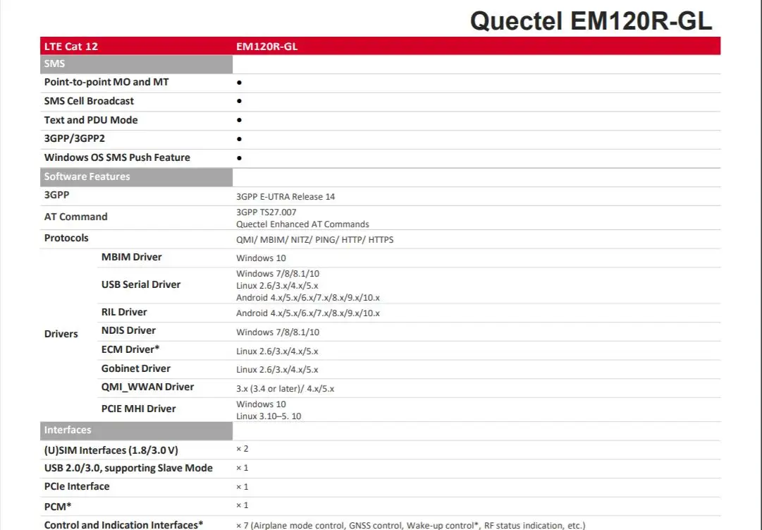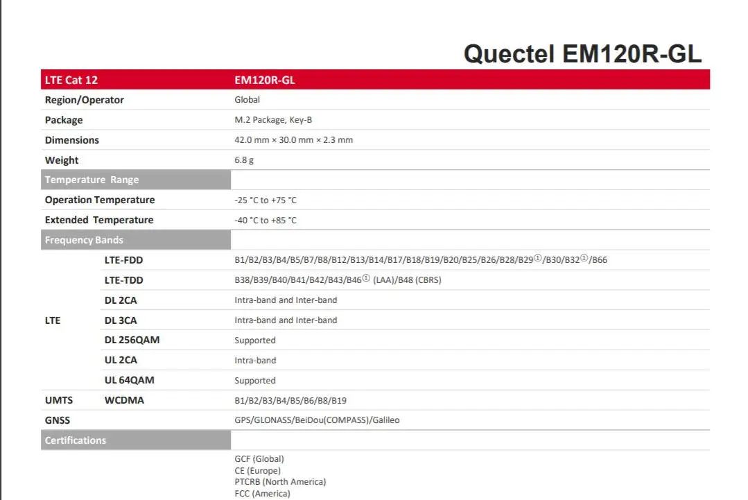El EM120R-GL es un módulo de categoría 12 en un factor de forma M.2 diseñado de acuerdo con la especificación de la versión 14 del 3GPP que soporta velocidades máximas de enlace descendente de 600Mbps y velocidades de enlace ascendente de 150Mbps.