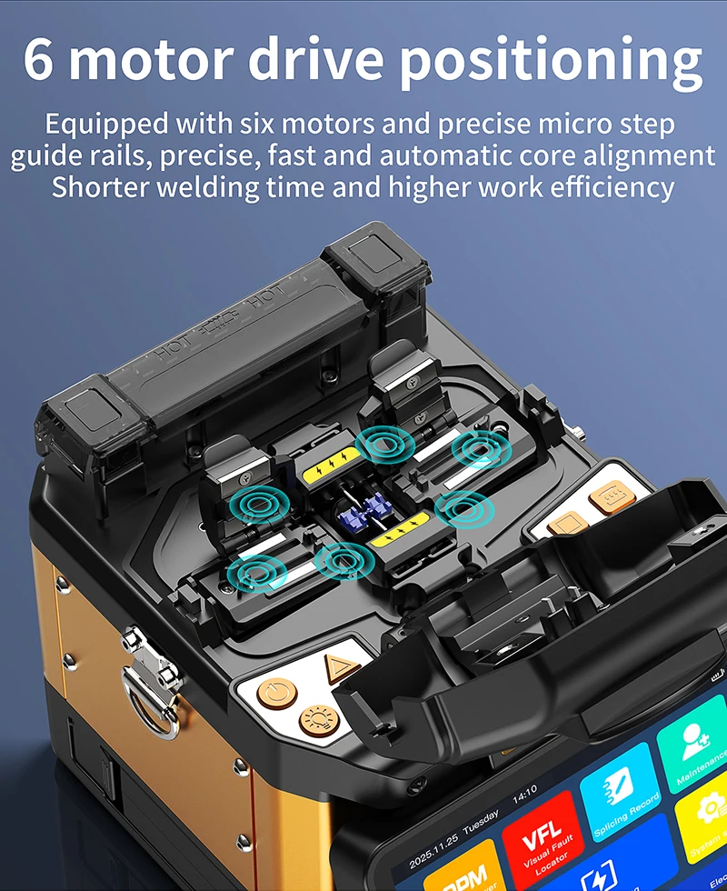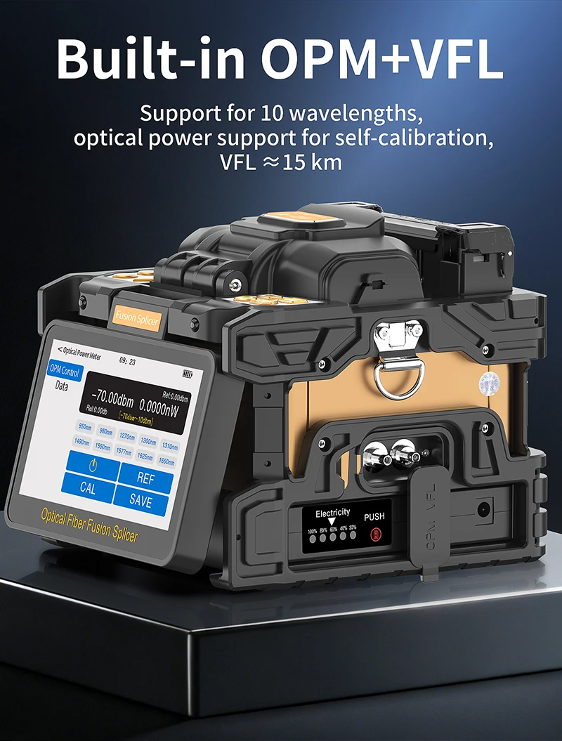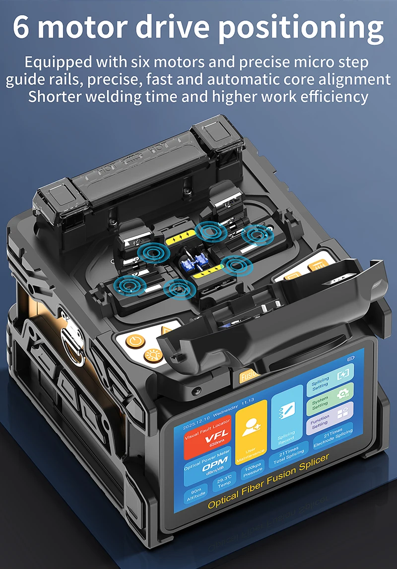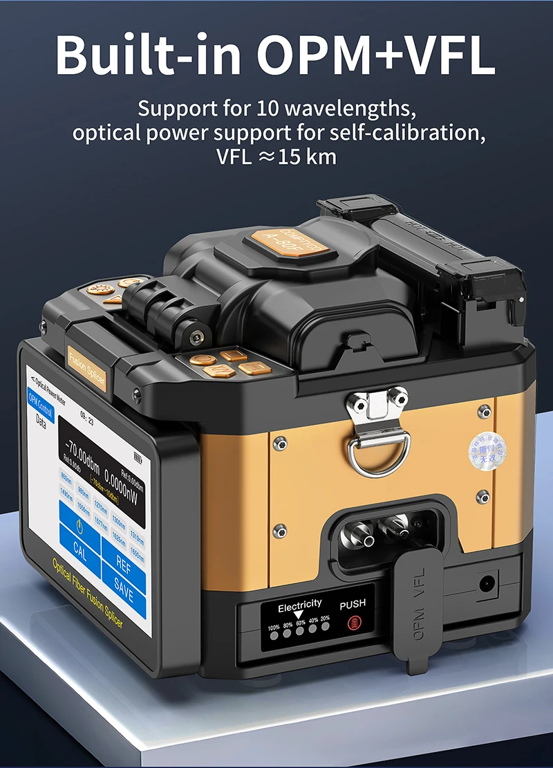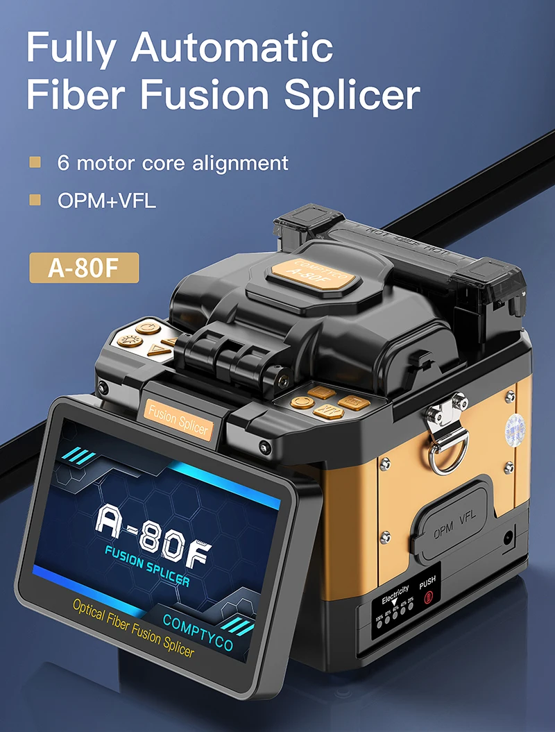 Empalmador de fibra Fuison totalmente automático, 6 motores, A-80F/A-10, pantalla táctil multilingüe, máquina de fusión en caliente de fibra óptica, VFL OPM integrada