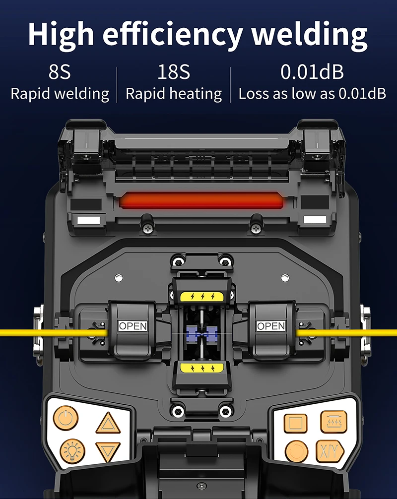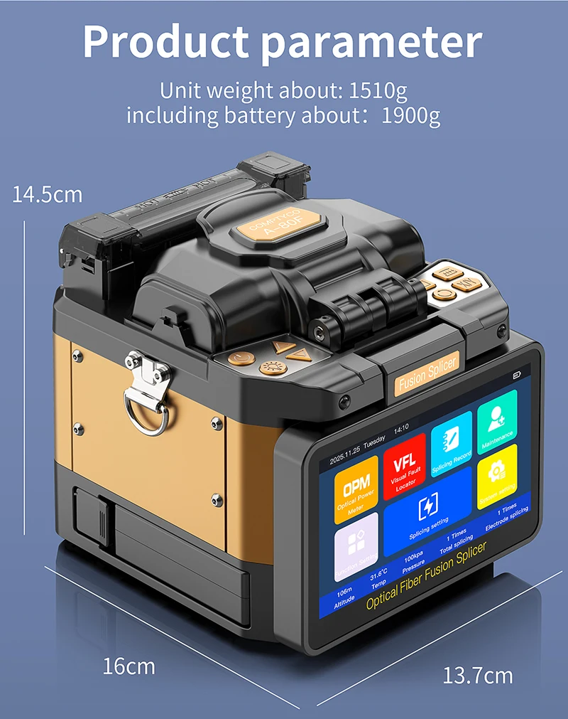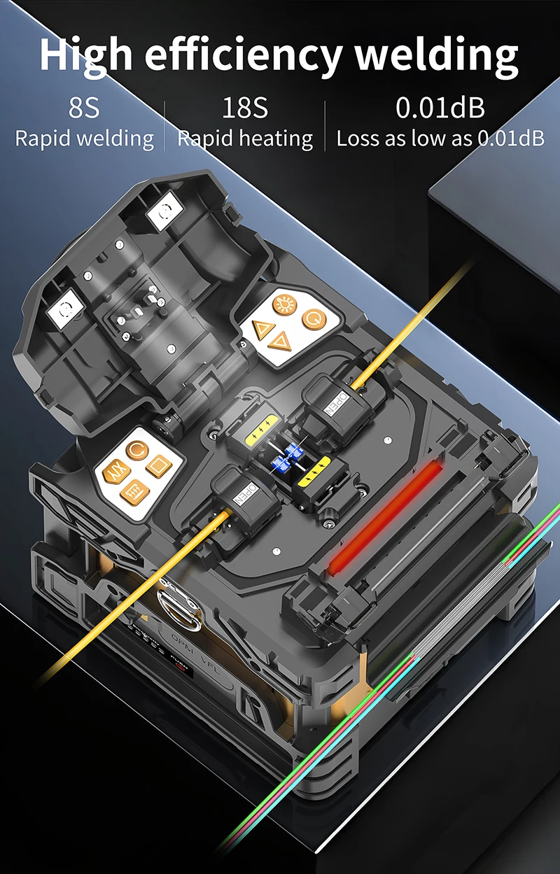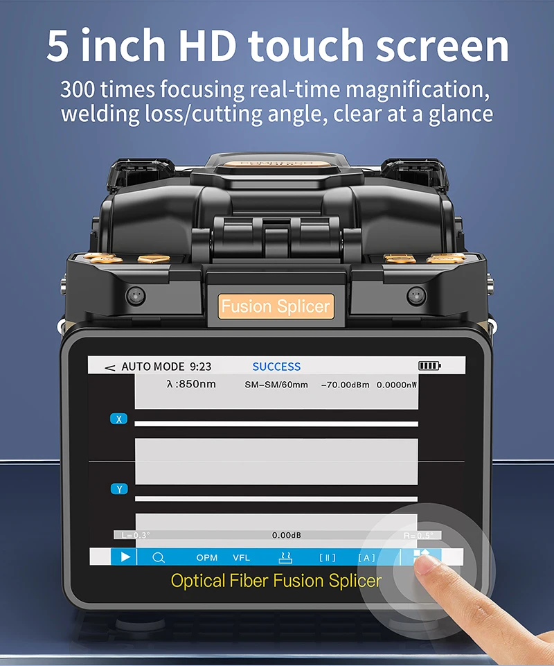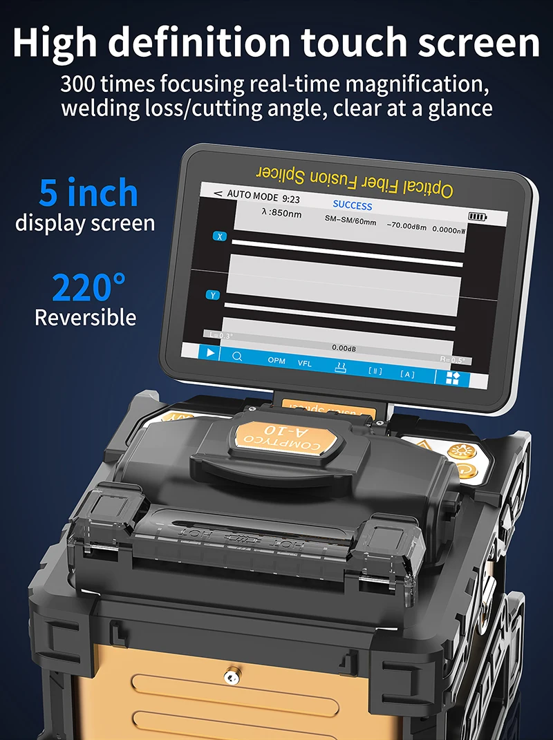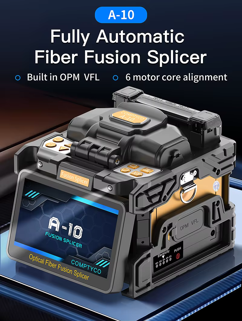 Empalmador de fibra Fuison totalmente automático, 6 motores, A-80F/A-10, pantalla táctil multilingüe, máquina de fusión en caliente de fibra óptica, VFL OPM integrada
