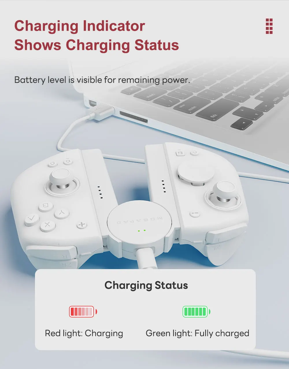 Stay informed with LED indicators that clearly display the charging status. Red light for charging, green light when fully charged, making it easy to track your controllers' power levels.