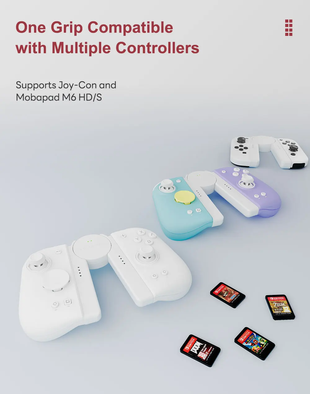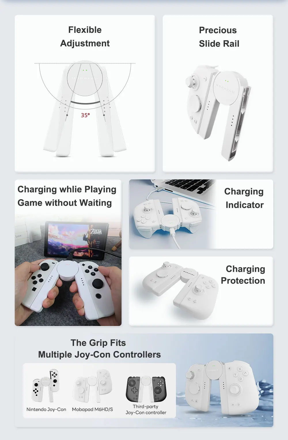 This versatile charging grip is designed for Nintendo Switch Joy-Con controllers, Mobapad M6HD/S controllers, and third-party Joy-Con alternatives, offering a universal solution for your gaming setup.
