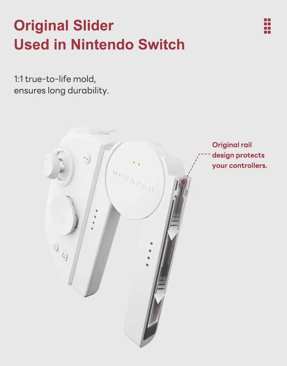 Simply slide your controller into the original Switch-like rail design and connect instantly. The charging grip is easy to use, durable, and built to last with its precise 1:1 mold based on the original Nintendo Switch Joy-Con rail.
