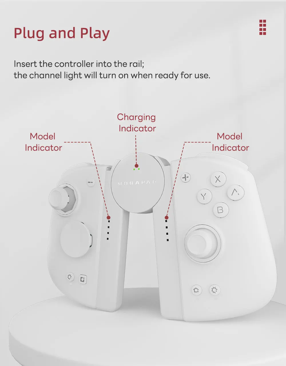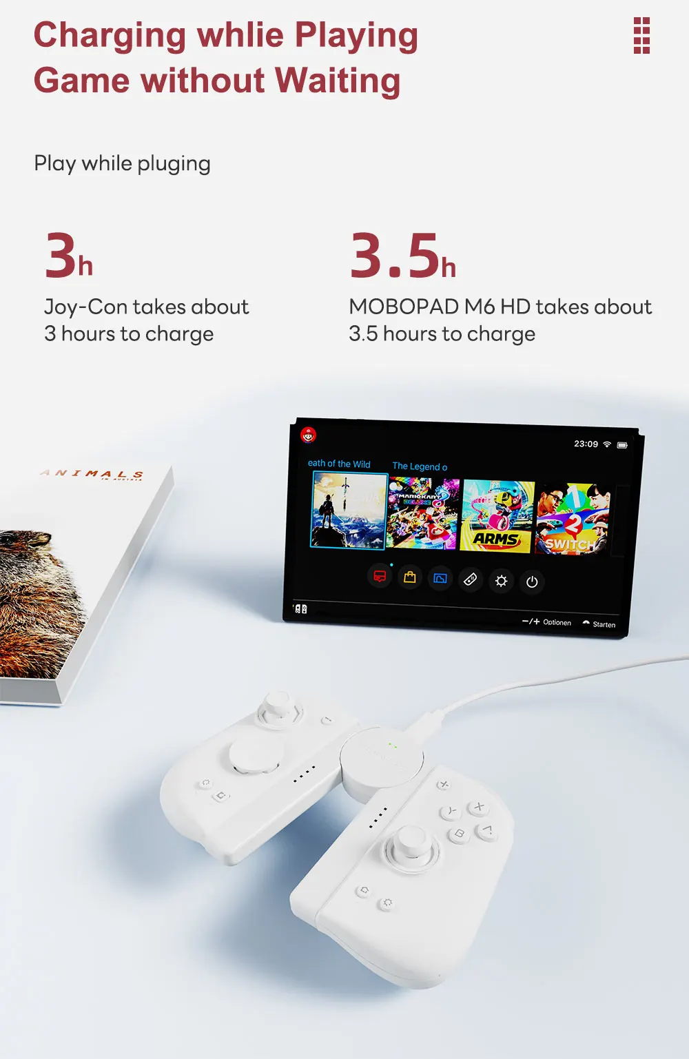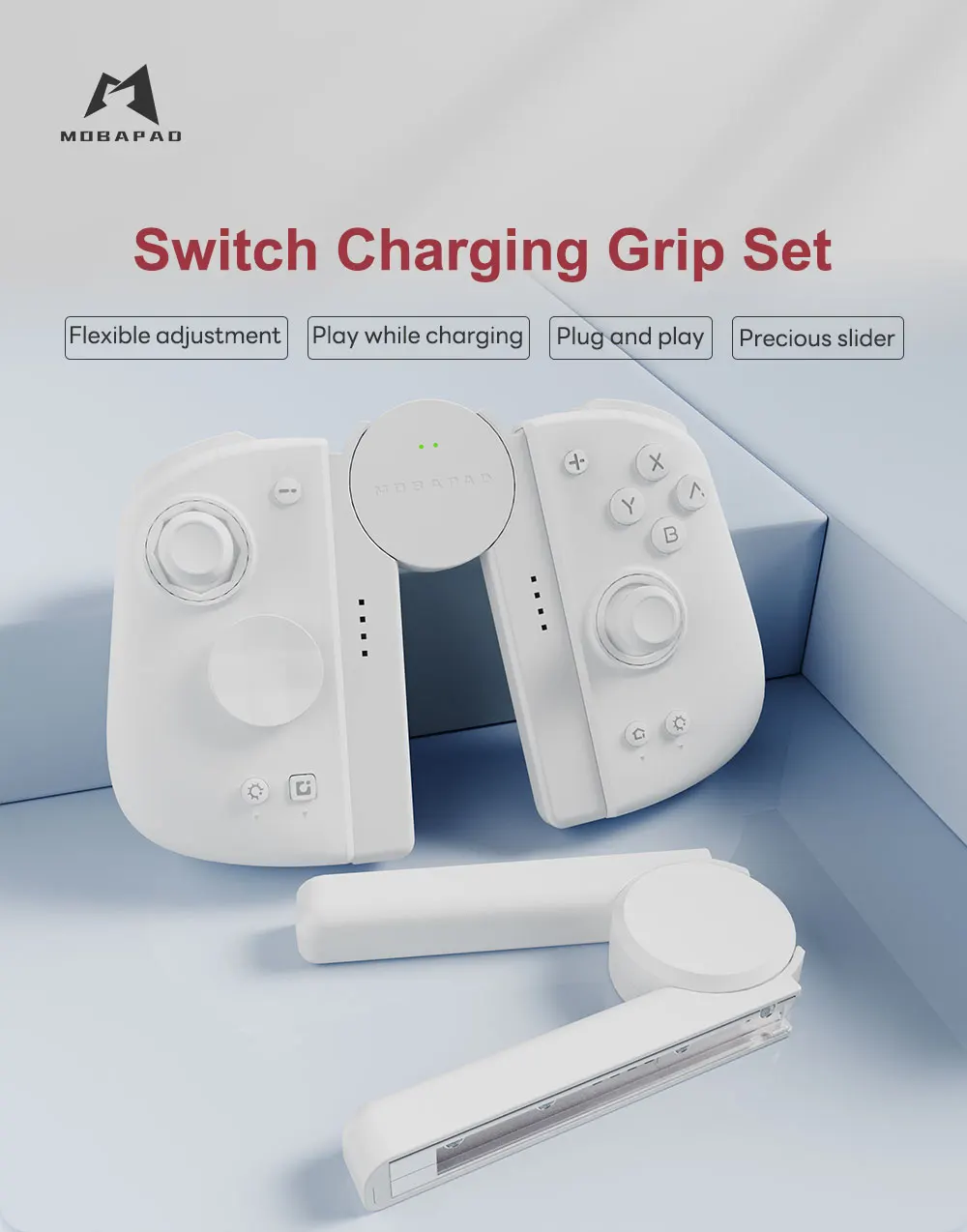 The Mobapad Charging Grip Set allows you to adjust your controller's angle to suit your preferred playing style. Enjoy uninterrupted gaming sessions by playing while your Joy-Con or Mobapad M6HD/S controllers charge.