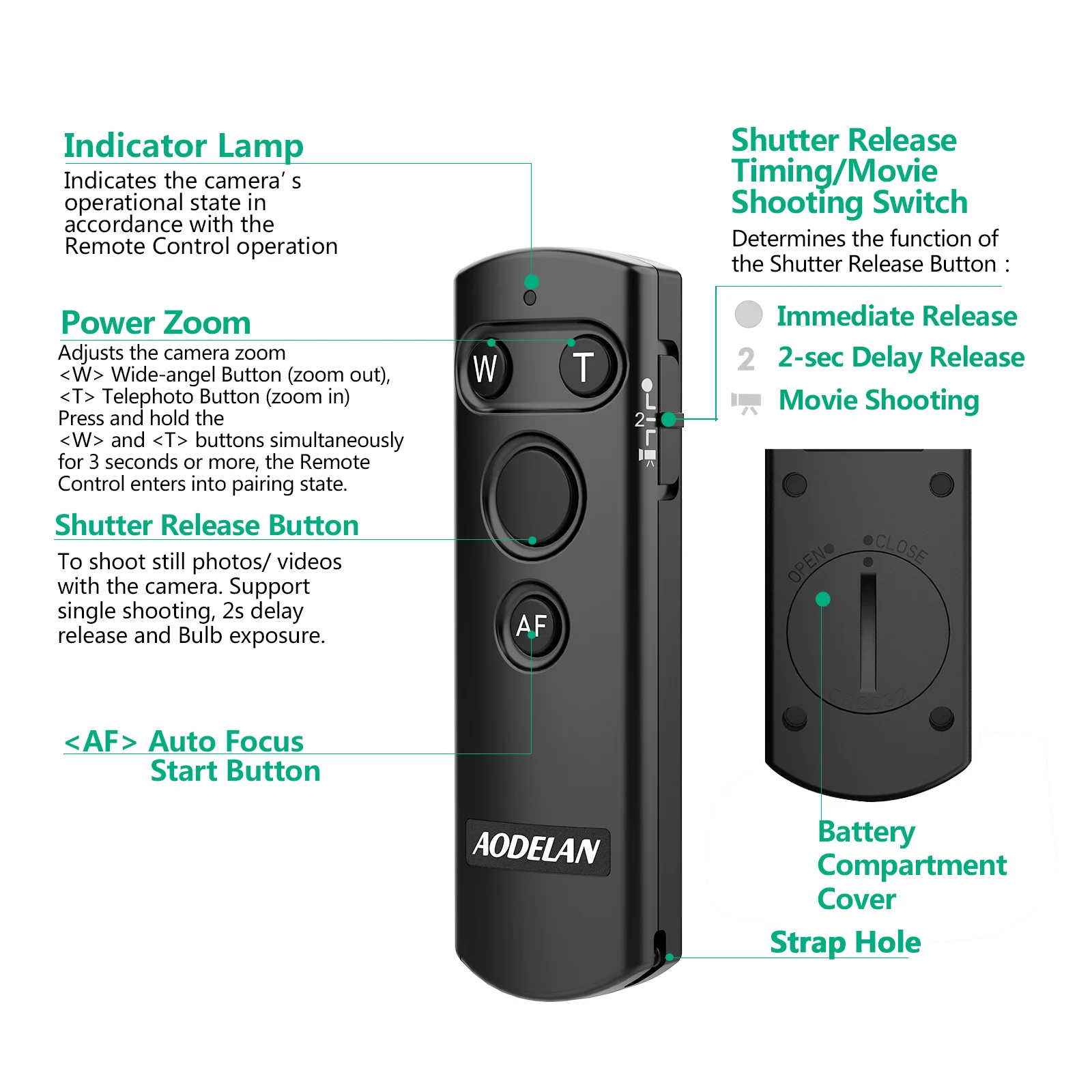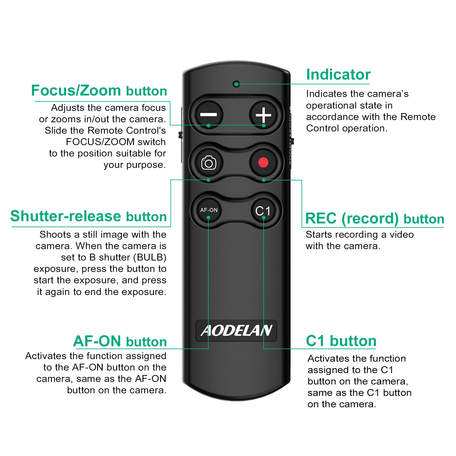 El control remoto inalámbrico desmontable de 10m/32,8 'se puede utilizar para tomar imágenes fijas, grabar vídeos, ajustar el enfoque de la Cámara, hacer zoom.