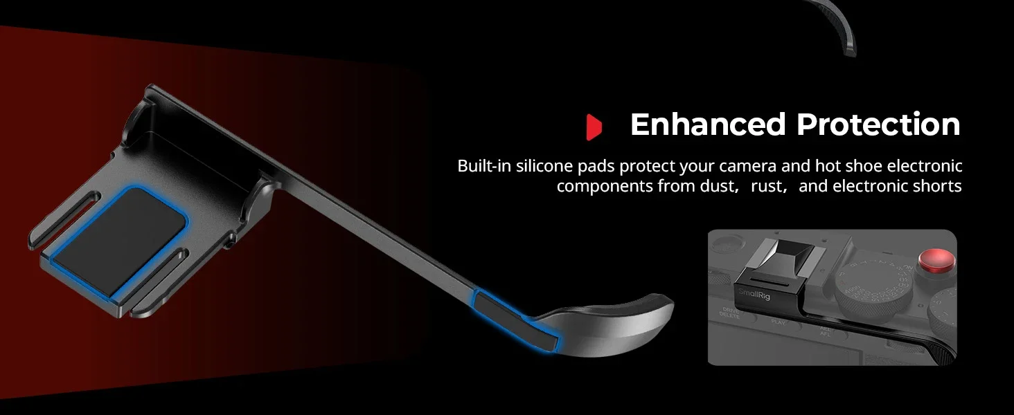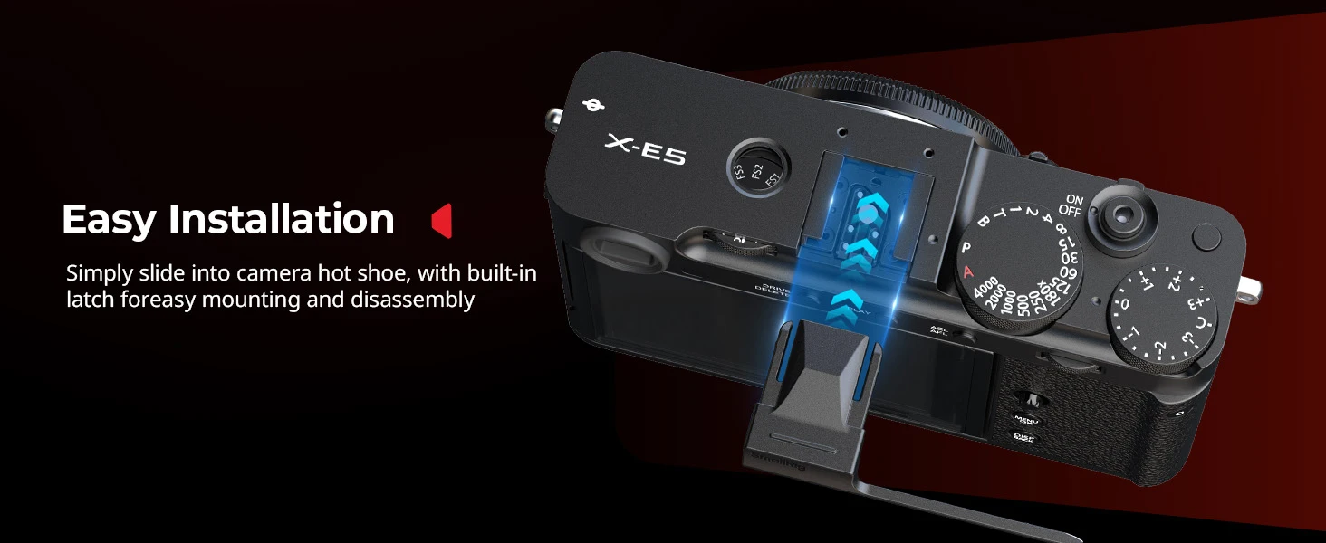 The geometric top design embodies minimalist aesthetics. Additionally, built-in silicone pads protect both the camera body and hot shoe contacts, while a strategically placed finger notch facilitates effortless installation and removal. Moreover, a complimentary shutter release button enhances tactile feedback, providing an elevated shooting experience.