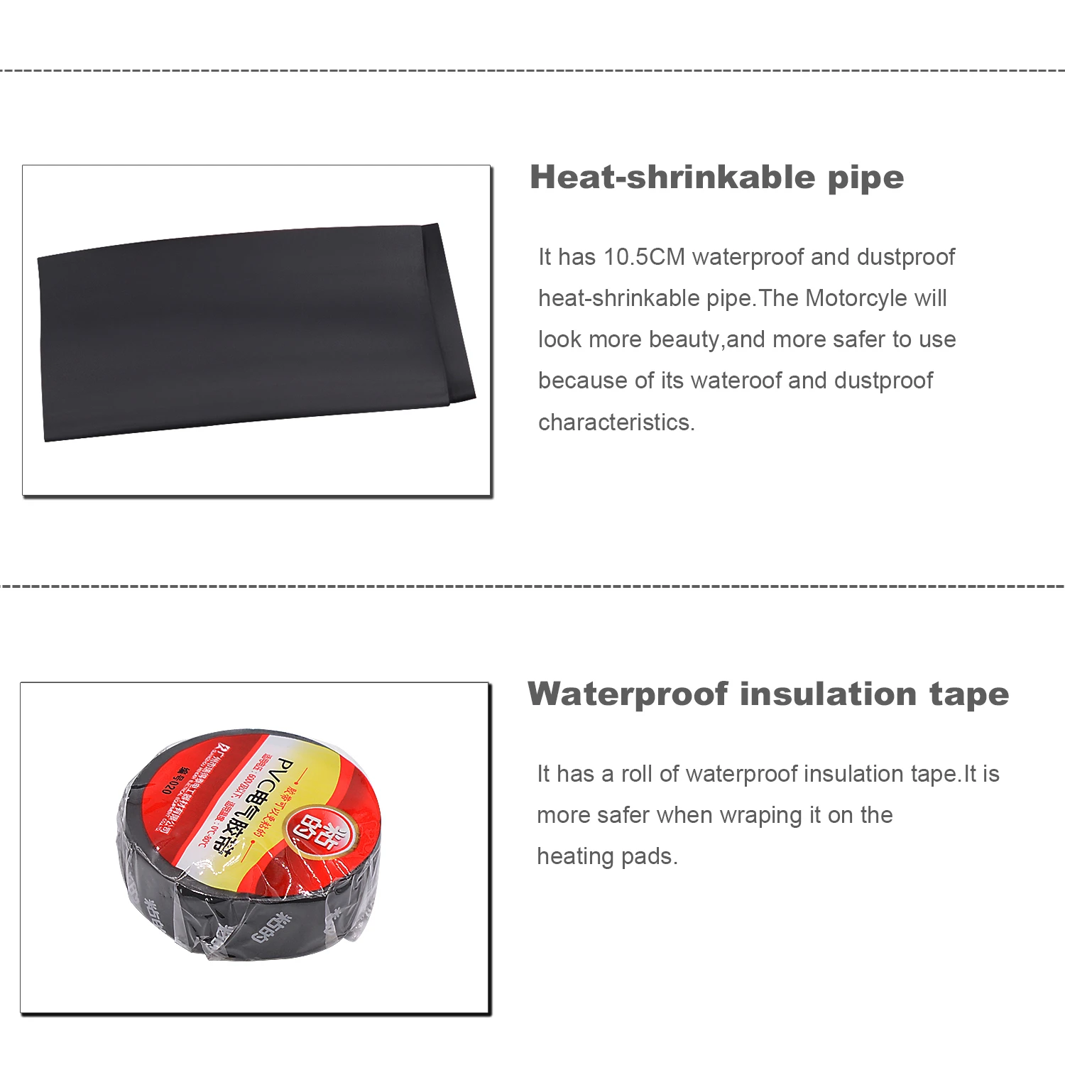 Instrucciones de instalación: 1.Coloque la placa térmica en la posición correcta. 2.Envuelva la placa térmica alrededor del manillar de manera uniforme, especialmente en la unión con la placa calefactora. 3. Coloque el tubo de la chaqueta y ajuste la posición, usando una pistola de aire caliente que sopla la uniformidad de contracción de la manga exterior. 4. Monte el interruptor en la varilla del espejo retrovisor. 5. Conecte la línea eléctrica. La línea roja y la línea negra no se dividen en positivo ni negativo, pero deben instalarse en el control de línea mediante la llave de encendido.