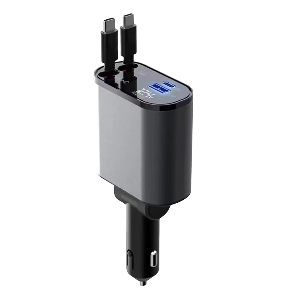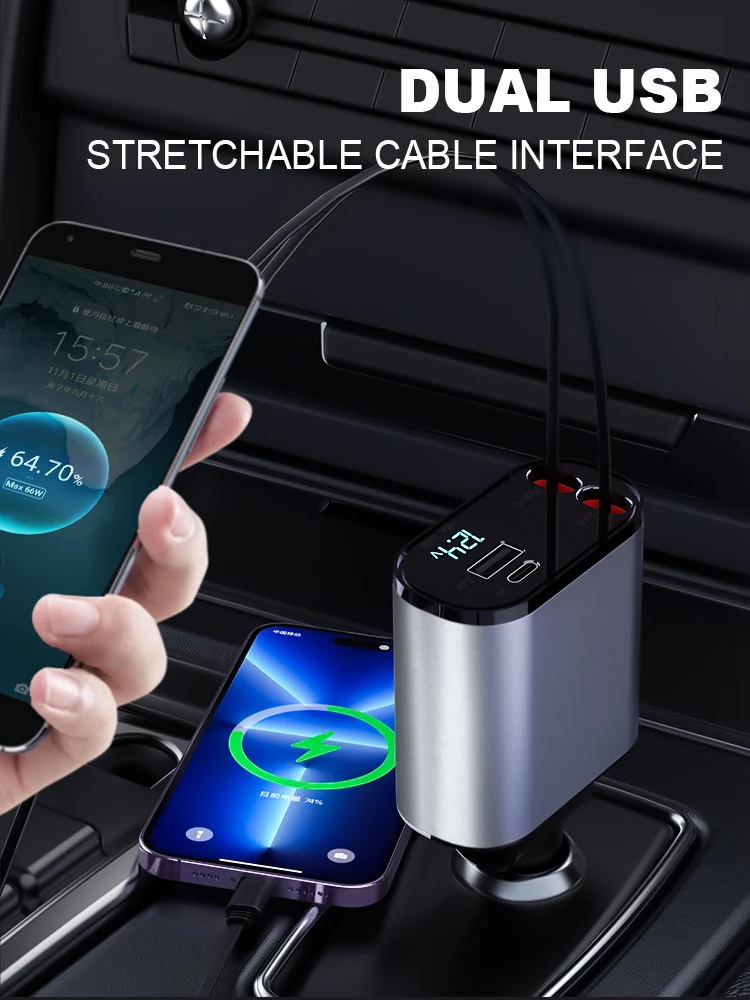1.Puertos USB duales e interfaz de cable telescópico:Nuestro cargador rápido para automóvil cuenta con dos puertos USB y una interfaz de cable expandible, lo que le permite cargar varios dispositivos simultáneamente.Esta característica garantiza que pueda mantener sus dispositivos encendidos mientras viaja.