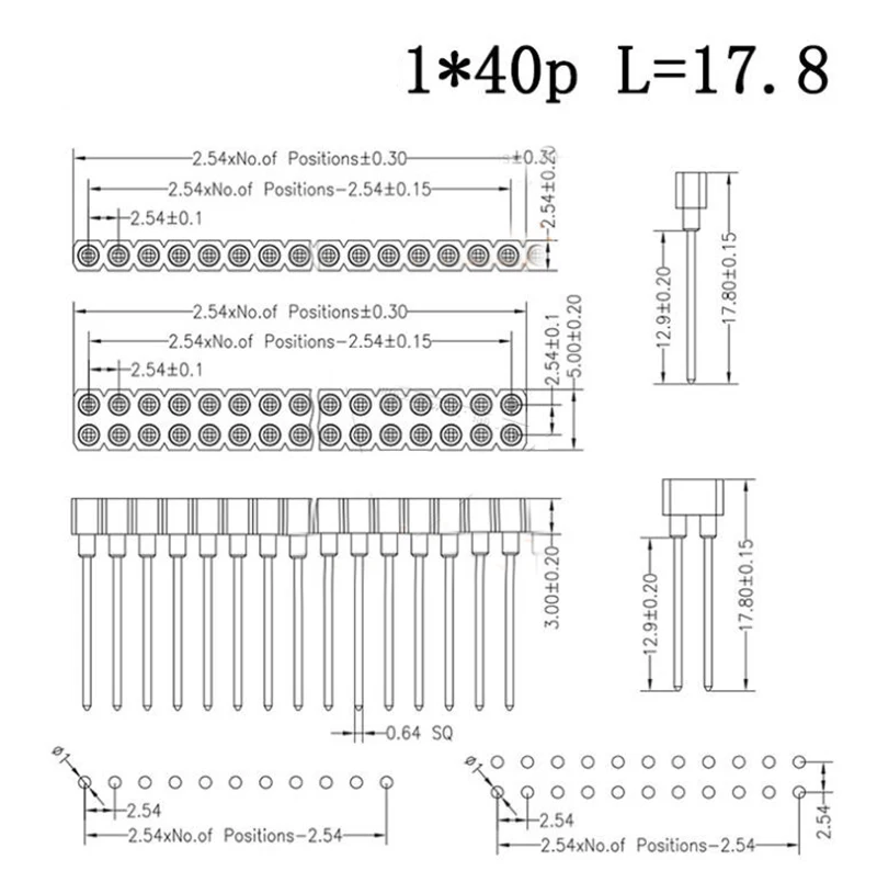 L17.8 con pines cuadrados 0.64SQ, acoplamiento con cabezales estándar macho/hembra de 2,54mm