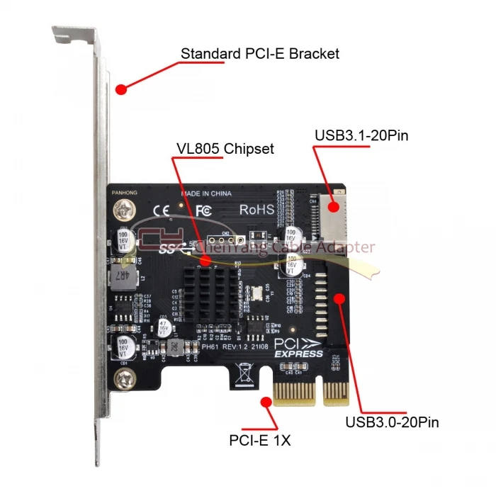 Enchufe de panel frontal USB 3,1 tipo E de 5Gbps y adaptador USB 2,0 a PCI-E 1X Express Card VL805 para placa base