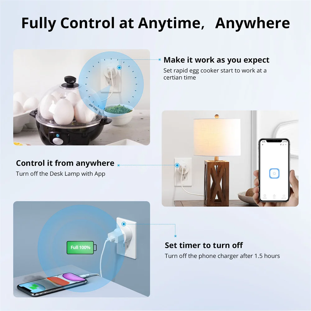 La configuración es simple y rápida, conecte la fuente de alimentación y siga las sencillas instrucciones para iniciar la configuración. Puede usar enchufes inteligentes para iluminar automáticamente, encender cafeteras, controlar calentadores de espacio y más. El enchufe inteligente Mini es una forma confiable de llevar sus dispositivos torpes a su hogar inteligente.