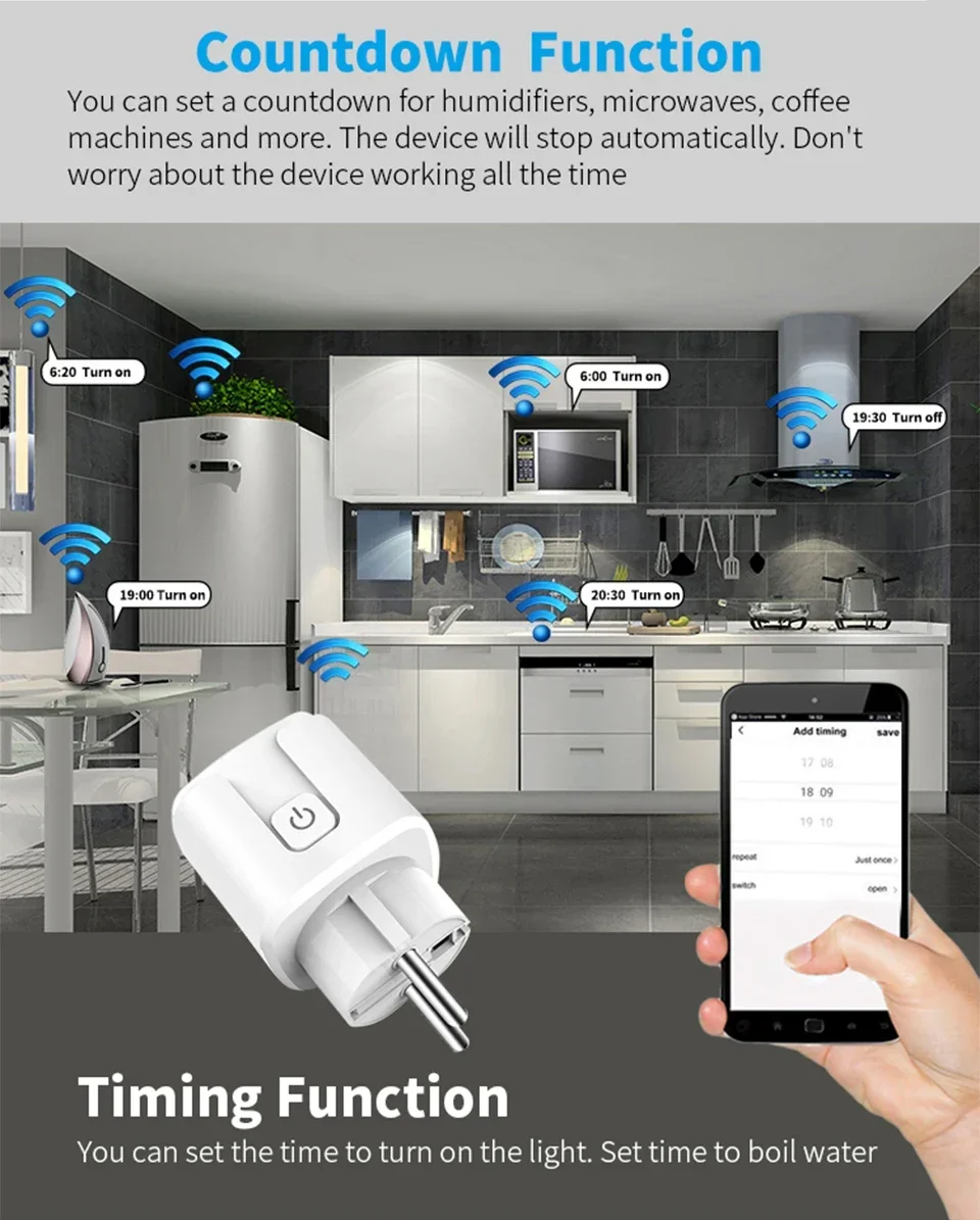 Cree grupo y temporizador: agregue sus electrodomésticos a un grupo y enciéndelos o apágalos con un solo comando.Configure temporizadores para los electrodomésticos y deje que el enchufe inteligente los encienda o apague automáticamente en un momento determinado. Nuestro enchufe inteligente puede ayudarlo a eliminar el desperdicio de energía en espera y reducir el consumo de energía, ahorrar en sus facturas de electricidad y extender la vida útil del producto.