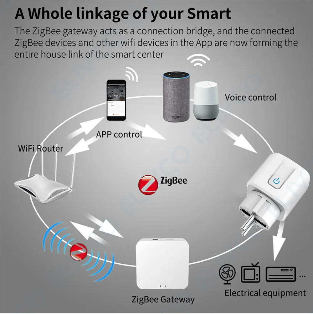 La puerta de enlace Zigbee actúa como un puente de conexión, y los dispositivos Zigbee conectados y otros dispositivos WiFi en la aplicación ahora forman el enlace completo de la casa del Centro Inteligente.