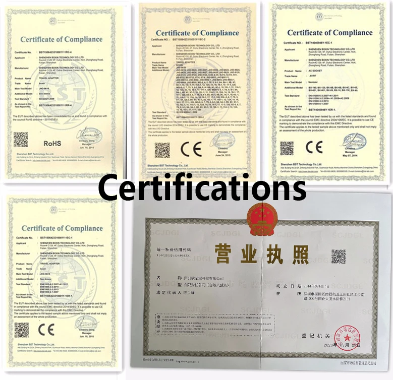 Adaptador y enchufes.Todos los productos con certificaciones CCC, CQC, CE y RoHs.Contamos con un conjunto completo de equipos de fabricación y