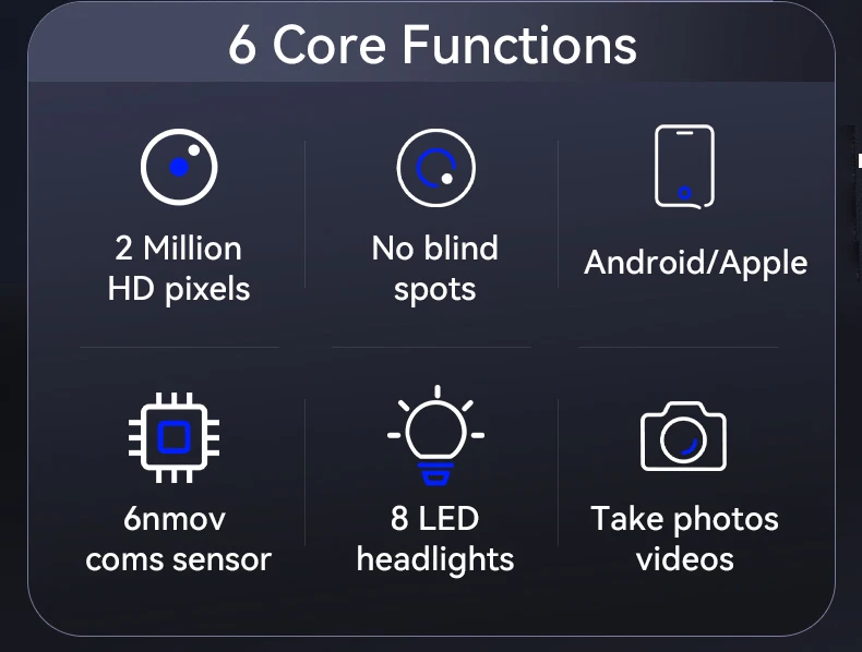 【Sonda pequeña y 8 luces LED】-El boroscopio articulado está equipado con un 8.Cámara de inspección de 5 mm rodeada por 8 luces LED para garantizar que se pueda capturar una imagen clara incluso en condiciones de oscuridad, lo que permite un fácil acceso a áreas difíciles de alcanzar como inspección mecánica, reparación de automóviles o camiones, reparación de plomería, instalación eléctrica, bricolaje doméstico, mejora de techo, pared, limpieza de reparación de aire acondicionado y más.