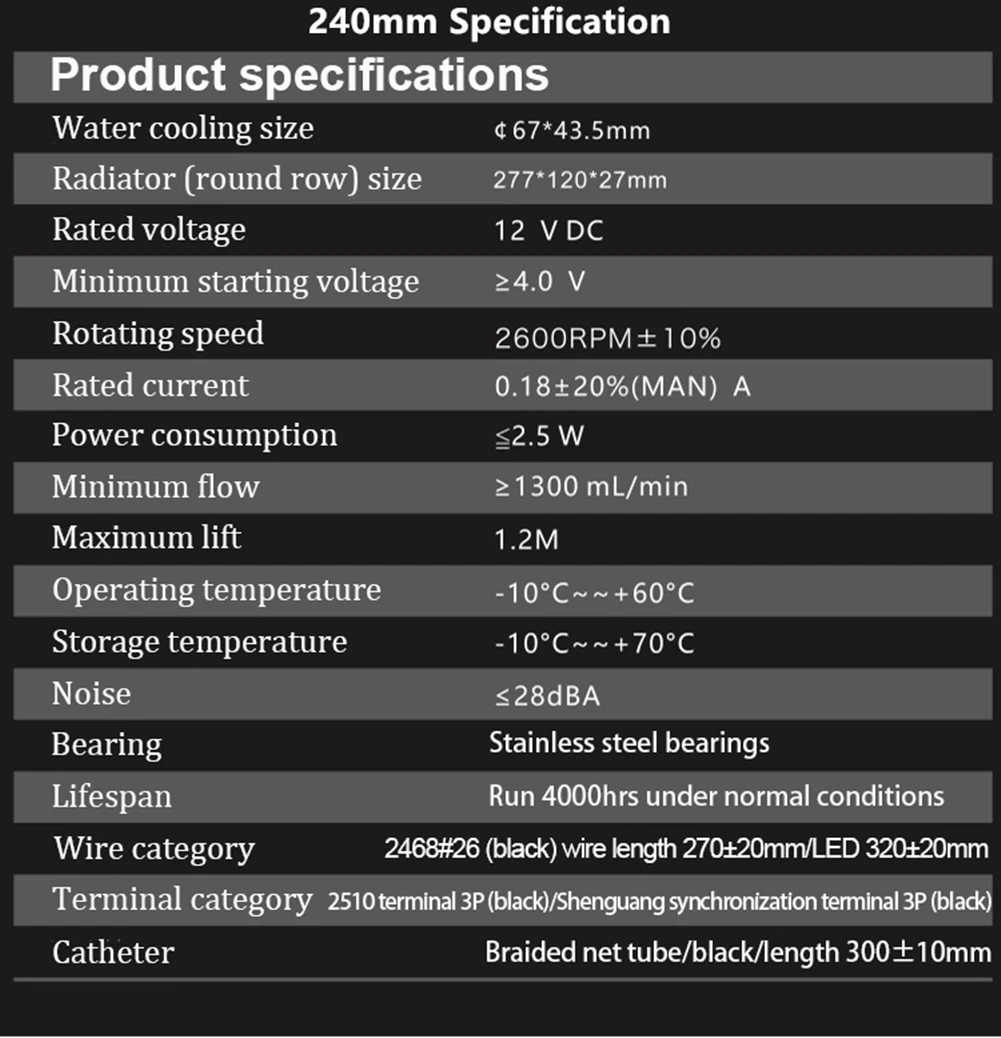 Interfaz del ventilador: 3 pines (120MM),PWM-4PIN (Color fijo de 240mm),6 pines (240mm ARGB, conectar con controlador)