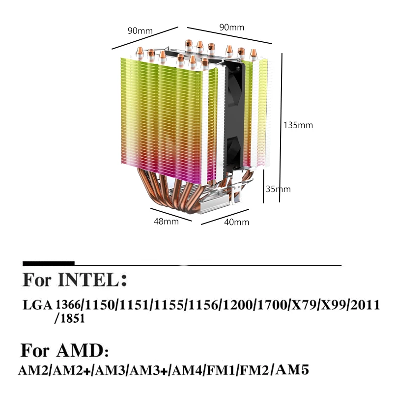 --Para AMD:AM4/AM2+/AM2/AM3+/AM3/FM1/FM2 (para AMD hay que mantener el soporte original en su placa base y simplemente abrochar el refrigerador estará bien)