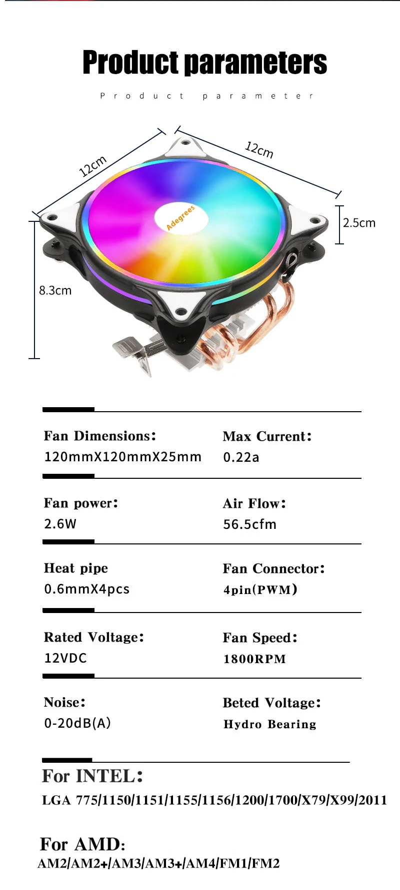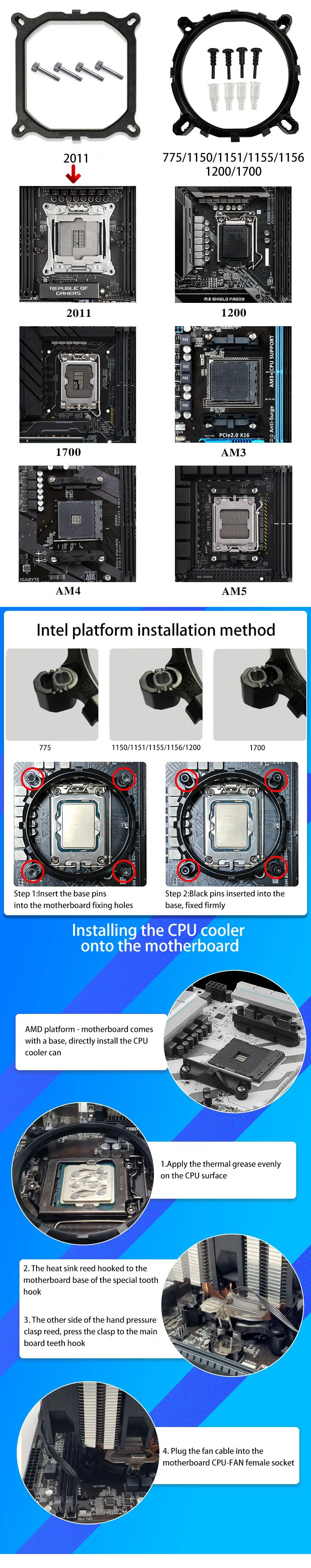 --Para AMD:AM5/AM2+/AM2/AM3+/AM3//AM4/FM1/FM2 (Para AMD debe mantener el soporte original en su placa base y simplemente abrochar el refrigerador estará bien)