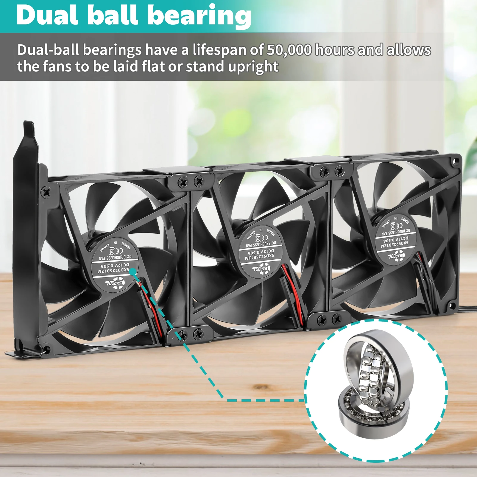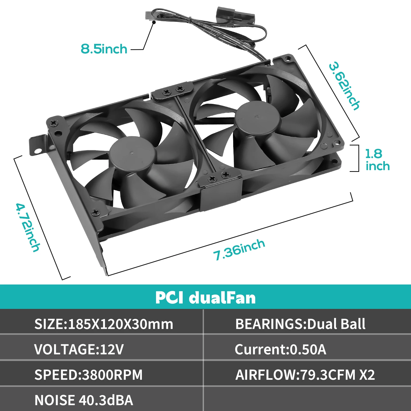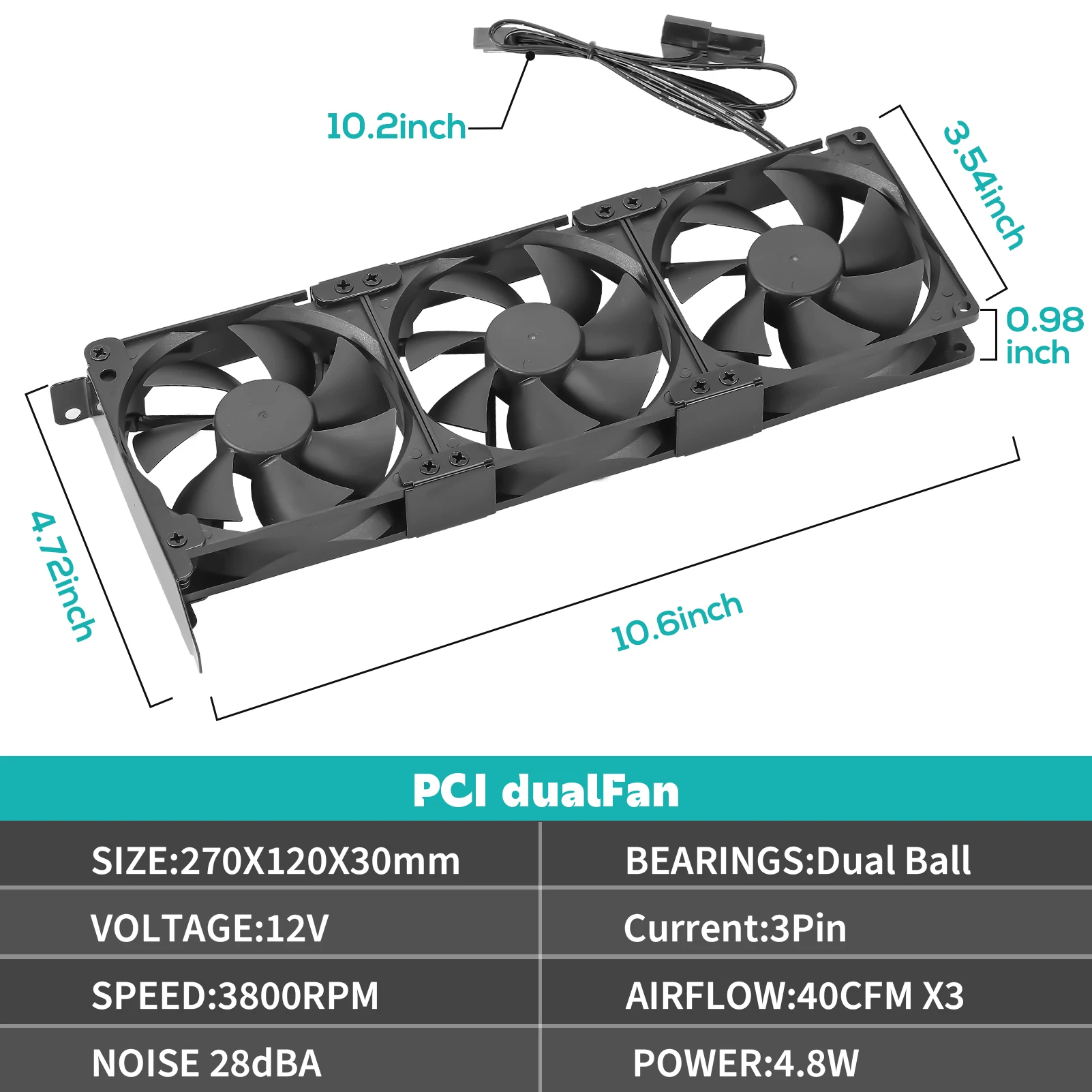 Dimensión: 92x92x25mmRodamiento: Rodamiento dobleVoltaje: CC 12 VConector: 3 pines + Molex 4DCorriente nominal: 0,50 amperios ± 10 %Velocidad del ventilador: 3800RPM±10%Flujo de aire: 79,3 CFM ± 10 %Nivel de ruido: 40,3 dBA ± 10 %Vida: 50000 horas
