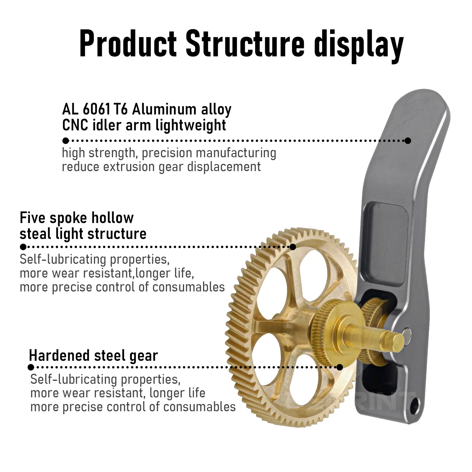 Diseño hueco:Los engranajes del extrusor A1 adoptan una estructura liviana hueca de cinco radios con engranajes reductores, que tienen menos inercia, un posicionamiento más preciso e una impresión perfecta.