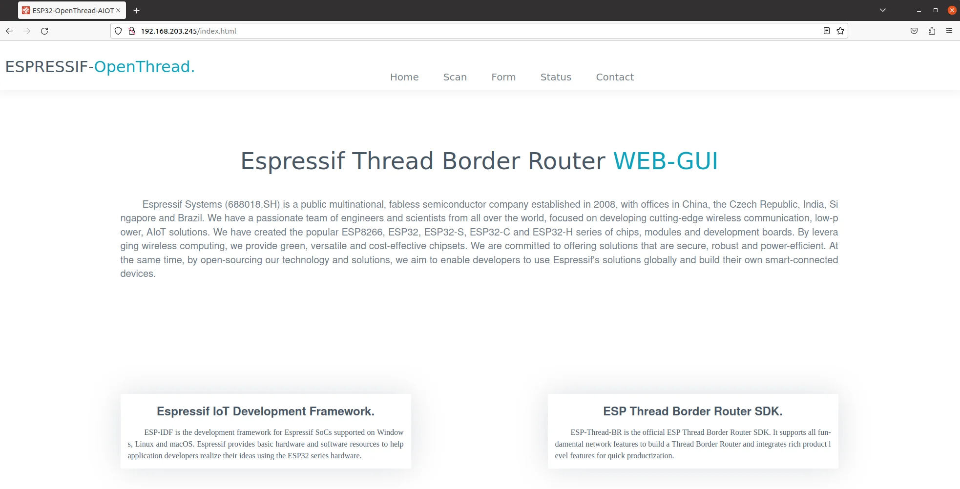 Para acceder a la GUI Web, simplemente ingreseThelocalIPv4addressPara el enrutador de borde de hilo ESP en la ventana de su navegador con puerto80Y el caminoIndex.html.