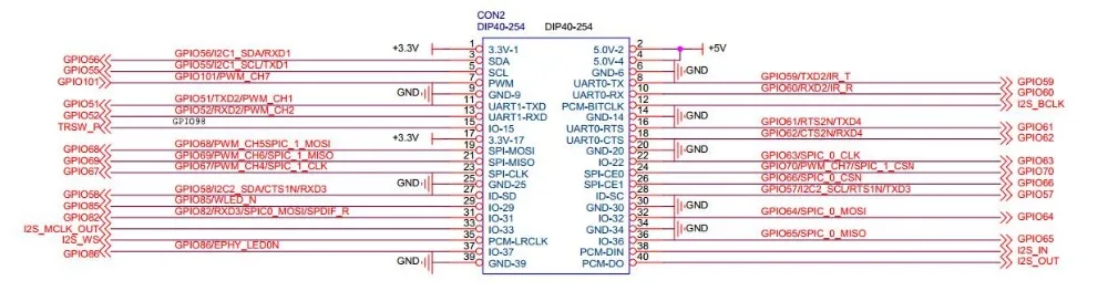 Conector de 40 pines, 28 × GPIO, algunos de los cuales se pueden utilizar para funciones específicas que incluyen UART, I2C, SPI, PWM, I2S.