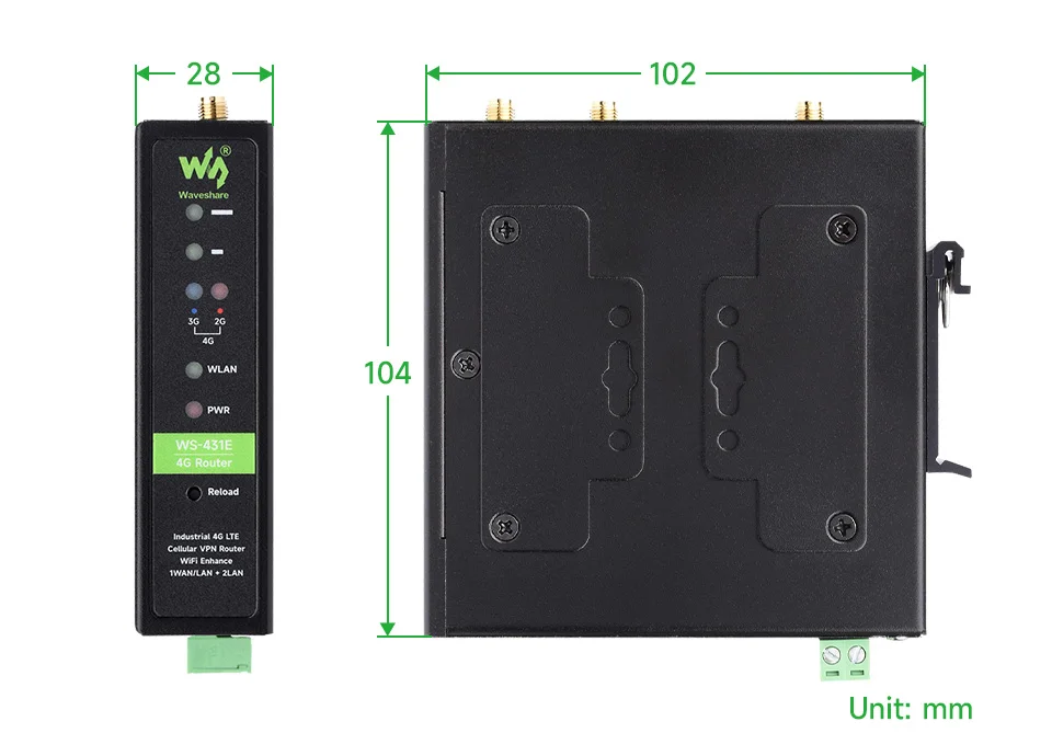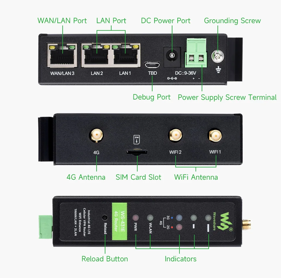 ElEnrutador WS-431E 4Ges un nuevo enrutador industrial mejorado Wi-Fi con solución Qualcomm con excelente capacidad antiinterferencias y rendimiento de conexión estable, admite punto de acceso WIFI, cliente WIFI y modos de relé WIFI, y está integrado con puertos 4G LTE, Wi-Fi, Ethernet (2LAN y 1WAN/LAN) y tecnologías VPN.