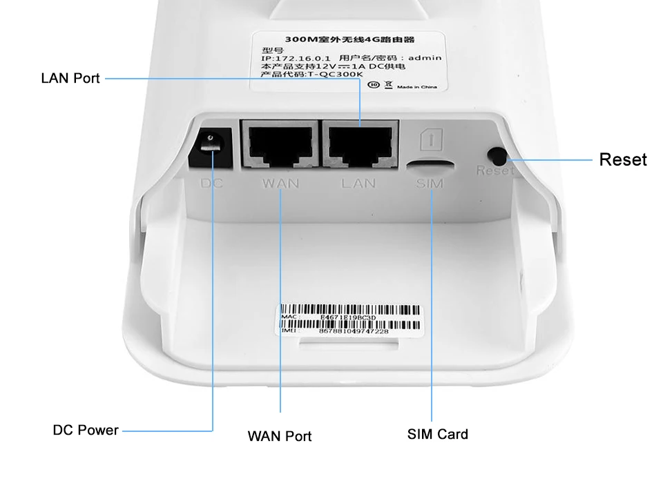 4.【 Característica principal Rendimiento 】 El enrutador exterior 4G es MTK7628KN y una antena de alta ganancia de 5dBi, equipado con 1 * LAN y 1 * Puerto Wan 1 * interfaz de ranura para tarjeta SIM, soporte 24V 0.5A fuente de alimentación POE