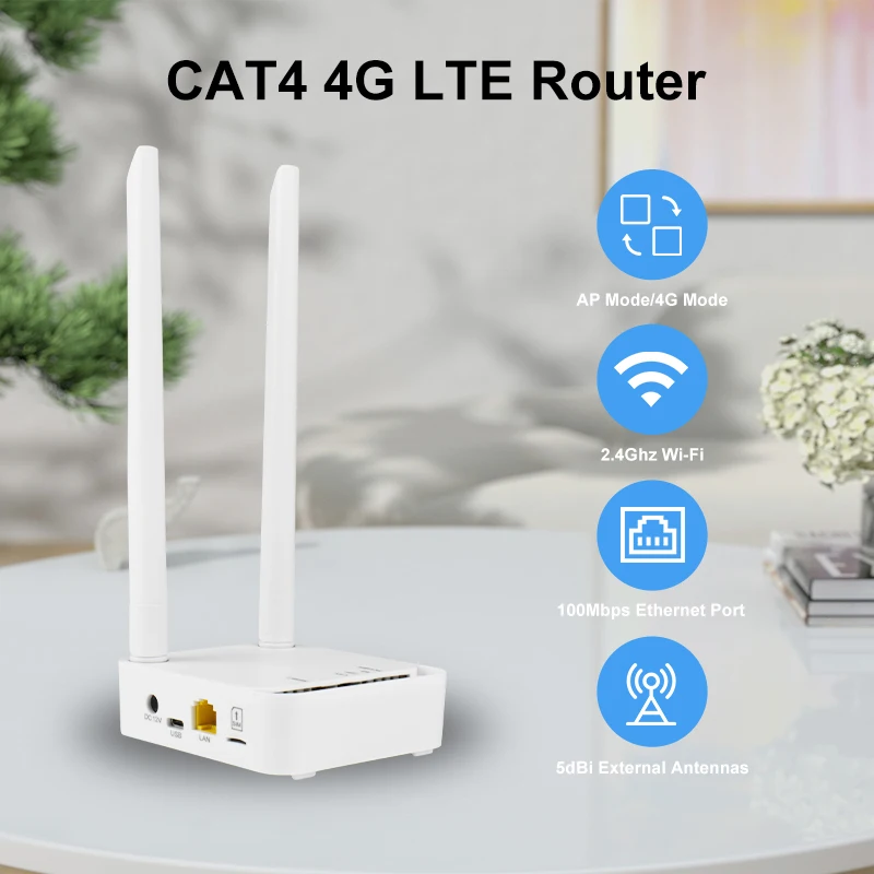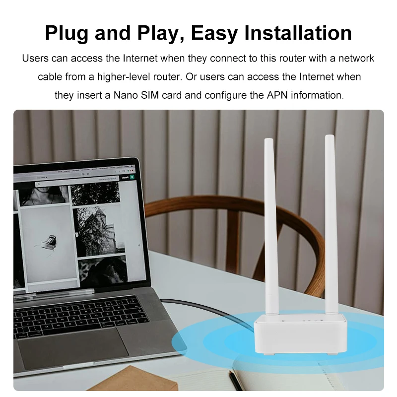 El enrutador proporciona una ranura para tarjeta Nano SIM.Después de insertar la tarjeta SIM y iniciar sesión en la interfaz de usuario WEB para configurar la información del APN, la señal de la tarjeta SIM se puede convertir en señal Wi-Fi. Velocidad de transmisión 4G LTE de hasta 150 Mbps (DL) / 50 Mbps (UL).