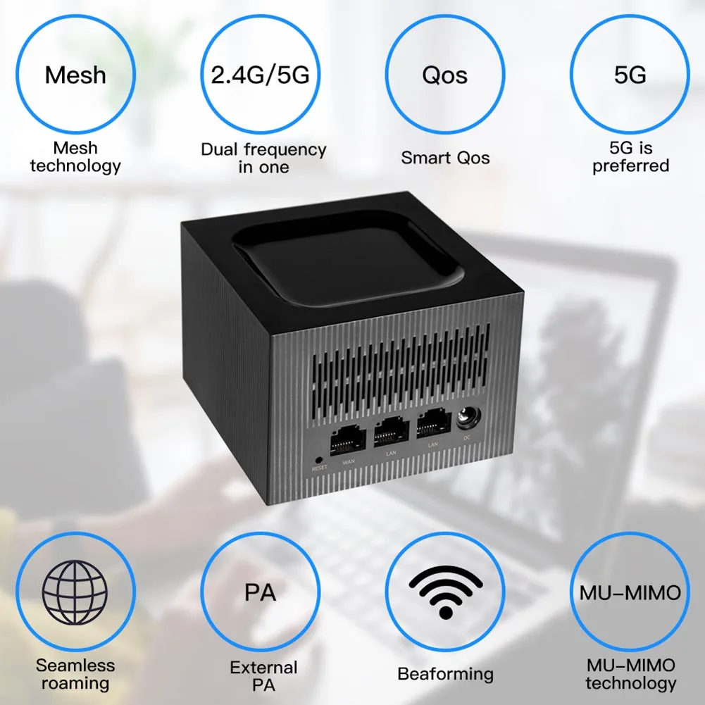4. Red WiFi fluida:Puede Reparar automáticamente las fallas de la red para garantizar una red WiFi fluida y de alta velocidad. La interfaz de usuario admite actualizaciones gratuitas de software web, y es fácil crear una malla con un solo clic a través del botón de malla. Cumple generalmente con los estándares IEEE 802.11ac, IEEE 802.11n, IEEE 802,11g y IEEE 802.11b.