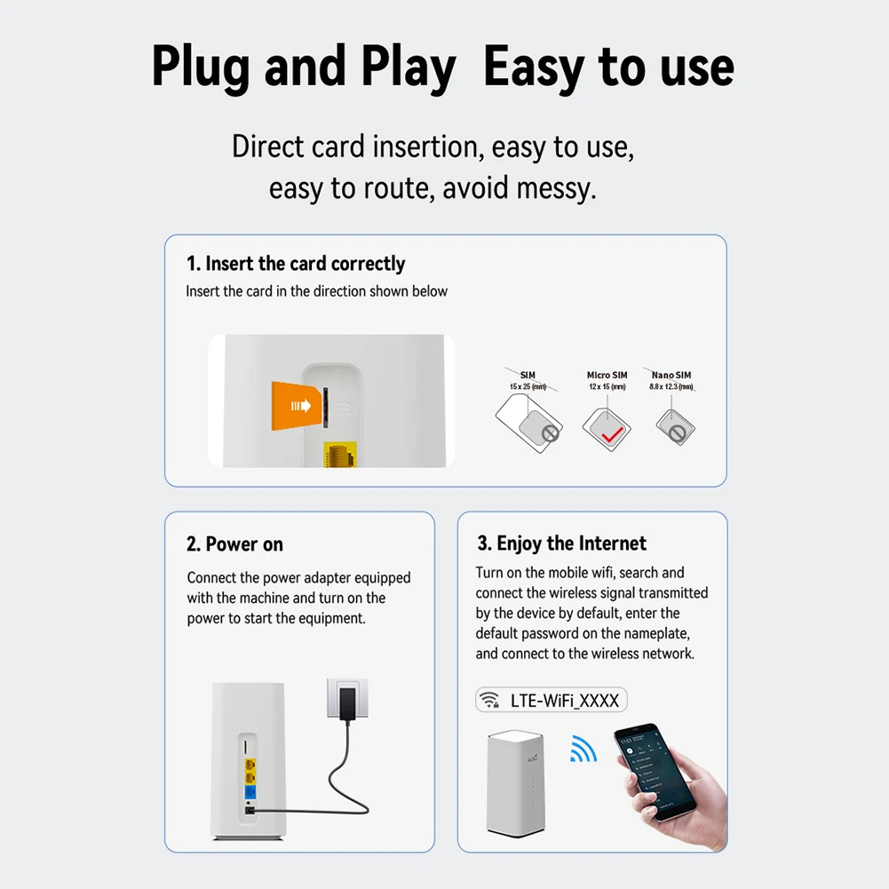5.Plug-and-Play:Con la inserción de la tarjeta SIM, este enrutador puede emitir una señal WiFi, lo que garantiza que tenga acceso a una red dondequiera que vaya.Dígale adiós a la frustración de no tener una red disponible, ya que el enrutador está listo para usar con comodidad plug-and-play.