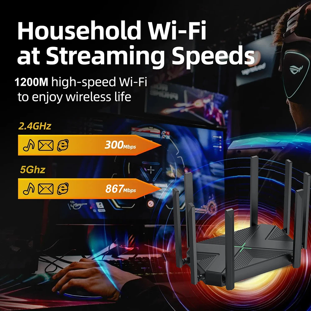 3. Velocidad de red rápida: su concurrencia de doble banda de 2,4 GHz(300Mbps) y 5GHz(867Mbps) permite velocidades de conexión inalámbrica de hasta 1200Mbps, que es 70% más rápido que los enrutadores 300M / 450M.