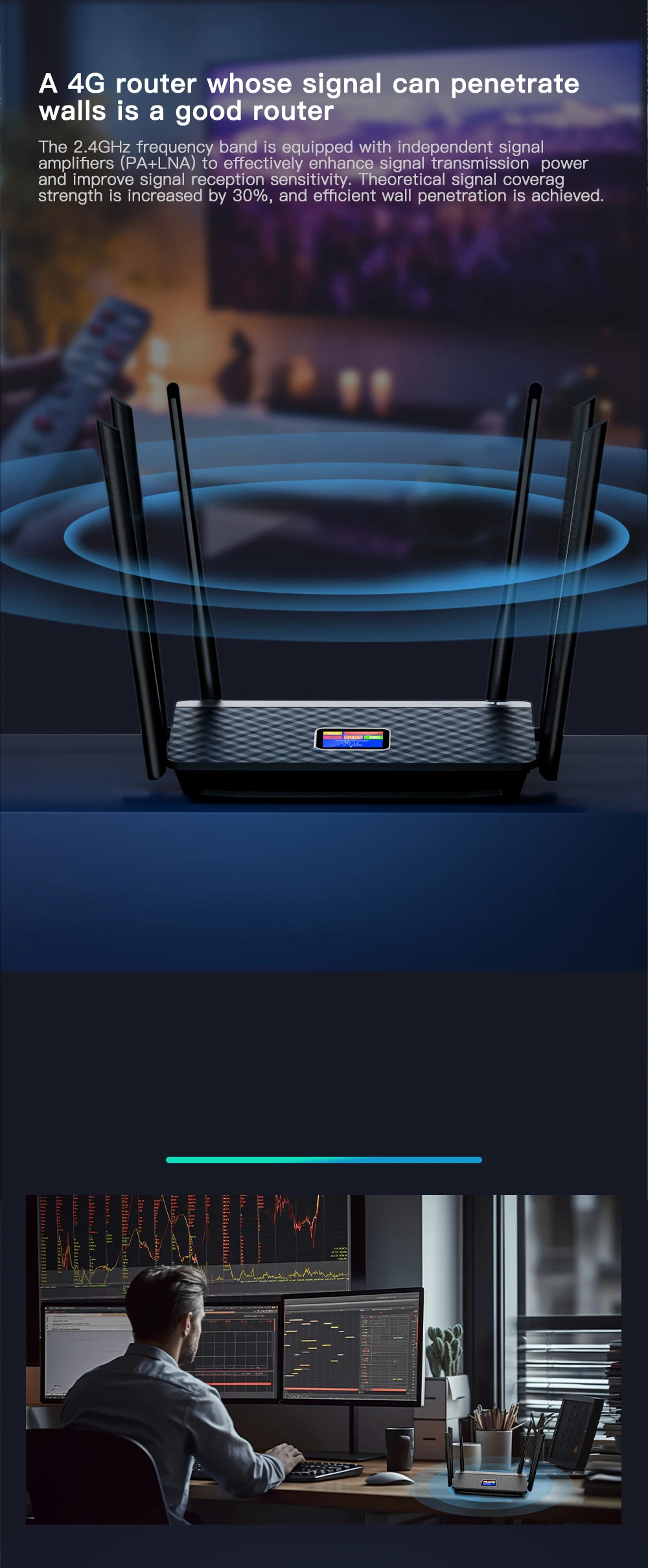 El enrutador 4G adopta el diseño de antenas externas de 6 piezas para mejorar la estabilidad y la cobertura de la transmisión de la señal. Brinde una mejor experiencia a los usuarios.Conexión inalámbrica/por cable