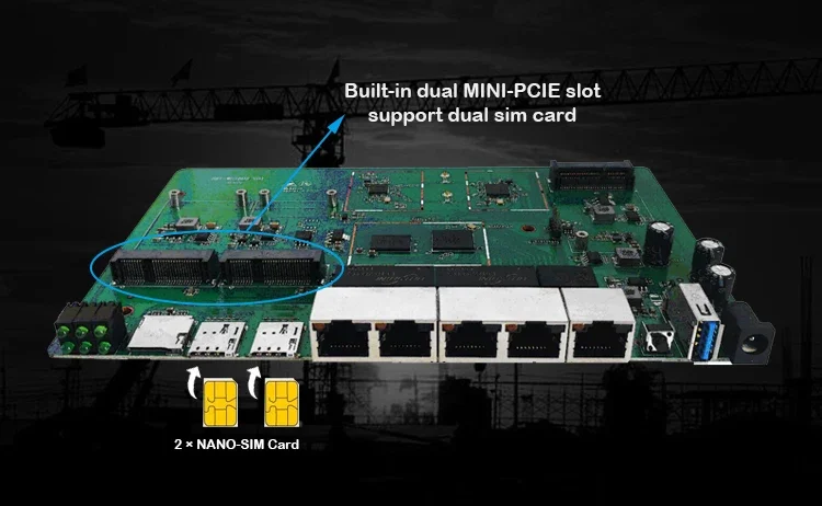 5.Ranura para tarjeta SIM dual, doble m-PCIE para instalar dos módems.