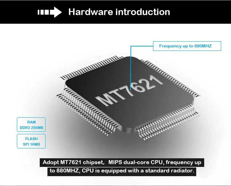 1.Conjunto de chips MT7621A, CPU de doble núcleo MIPS, la frecuencia principal es de hasta 880 MHz.