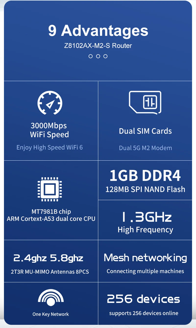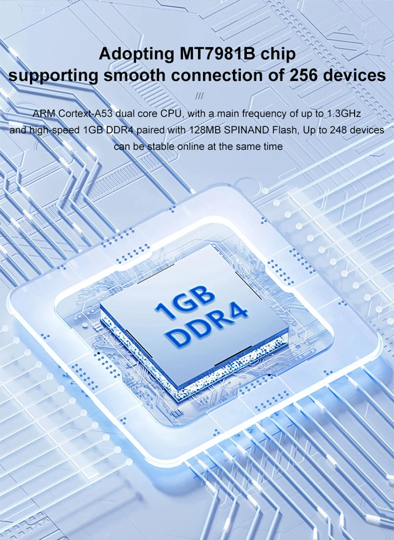 ● AdoptandoMT7981BChip, CPU de doble núcleo ARM Cortext-A53, con una frecuencia principal de hasta 1,3 GHz