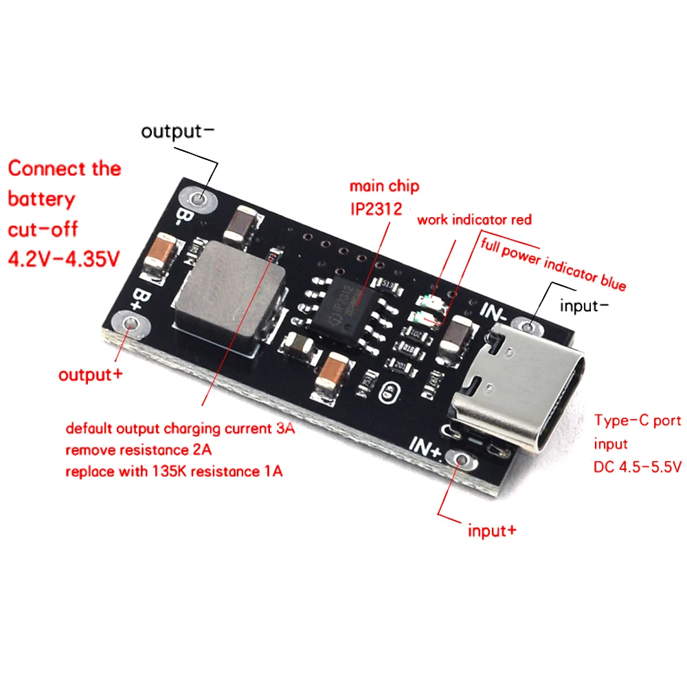Comprar Entrada USB tipo C, batería de litio ternaria de polímero de iones de litio de alta corriente 3A, placa de carga rápida IP2312 CC/CV 5V a 4,2 V 4,35 V