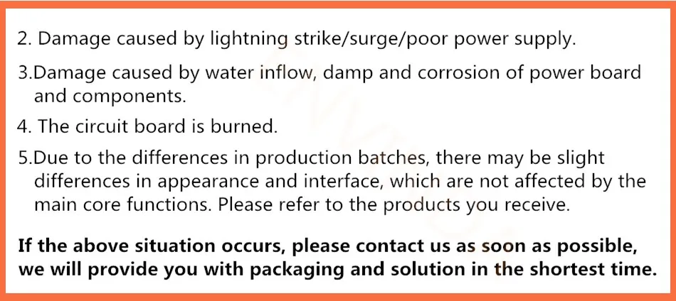 Comuníquese primero con nuestro personal de servicio al cliente para ayudarlo a resolver el problema y obtener ayuda. La resolución de problemas es importante y necesaria. Por favor, crea en la lealtad y capacidad de nuestro personal de servicio al cliente.