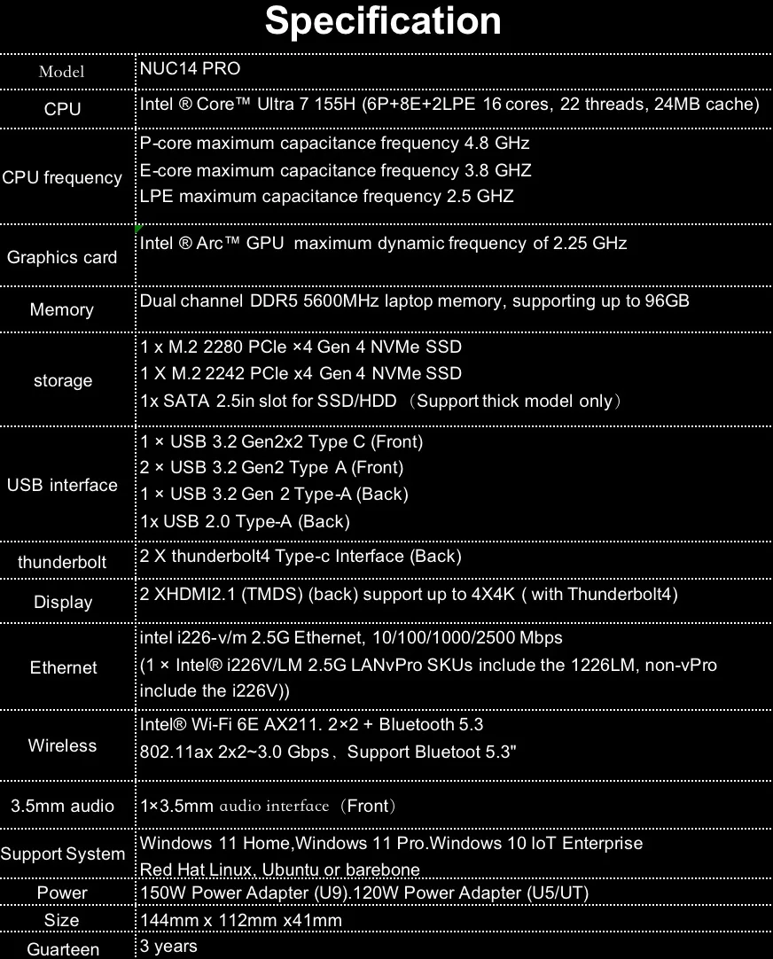 【Memoria】2 x SO-DIMM, memoria DDR5-5600MHz, hasta 96GB (48GB*2); 【Almacenamiento】1 x soporte de ranura SSD NVMe M.2 2280 PCIe Gen4x4, 1x soporte de ranura SSD NVMe M.2 2242 PCIe x4 NVMe