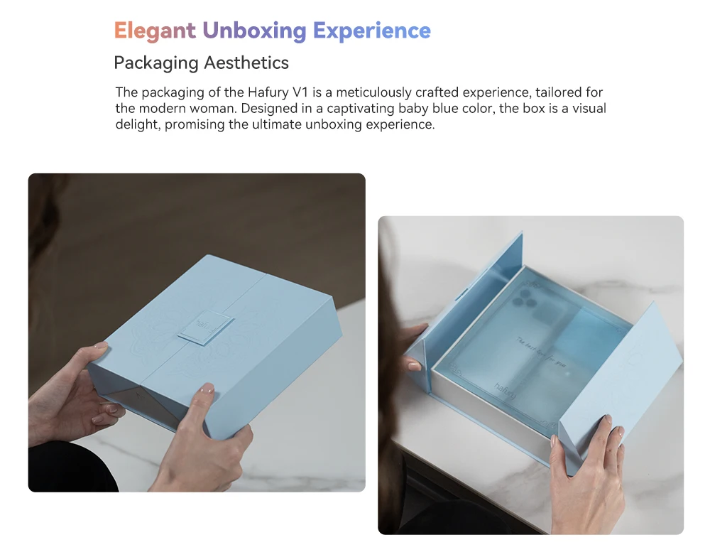 El embalaje del Hafury V1 es una experiencia meticulosamente elaborada, adaptada a la mujer moderna.Diseñada en un cautivador color azul bebé, la caja es un deleite visual que promete la mejor experiencia de desembalaje.