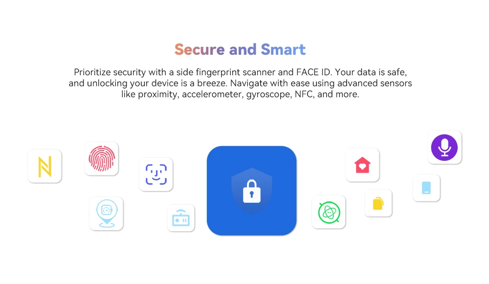 Priorice la seguridad con un escáner de huellas dactilares lateral y FACE ID.Sus datos son seguros y desbloquear su dispositivo es muy sencillo.Navegue con facilidad utilizando sensores avanzados como proximidad, acelerómetro, giroscopio, NFC y más.
