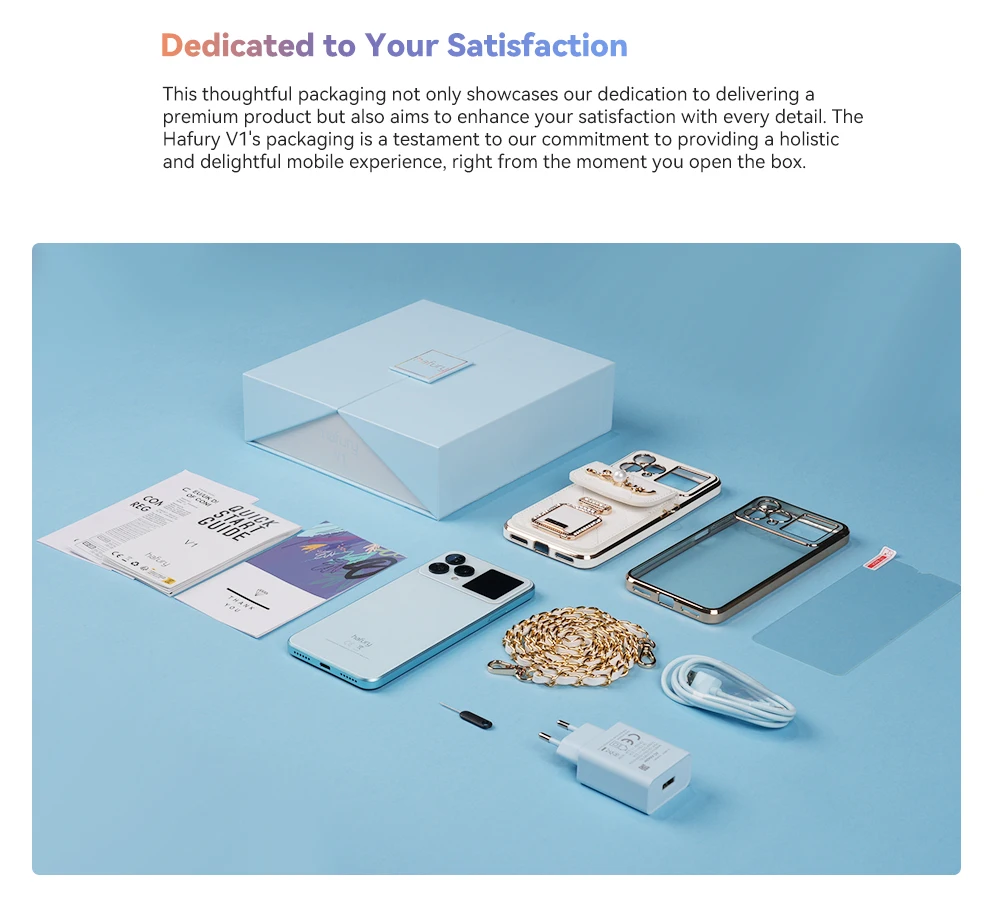 Este cuidadoso embalaje no sólo muestra nuestra dedicación a ofrecer un producto premium sino que también tiene como objetivo mejorar su satisfacción con cada detalle.El embalaje de Hafury V1 es un testimonio de nuestro compromiso de brindar una experiencia móvil holística y encantadora, desde el momento en que abre la caja.