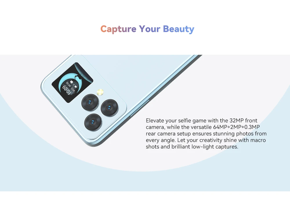 Mejore su juego de selfies con la cámara frontal de 32 MP, mientras que la versátil configuración de la cámara trasera de 64 MP + 2 MP + 0,3 MP garantiza fotografías impresionantes desde todos los ángulos.Deja que tu creatividad brille con tomas macro y capturas brillantes con poca luz.