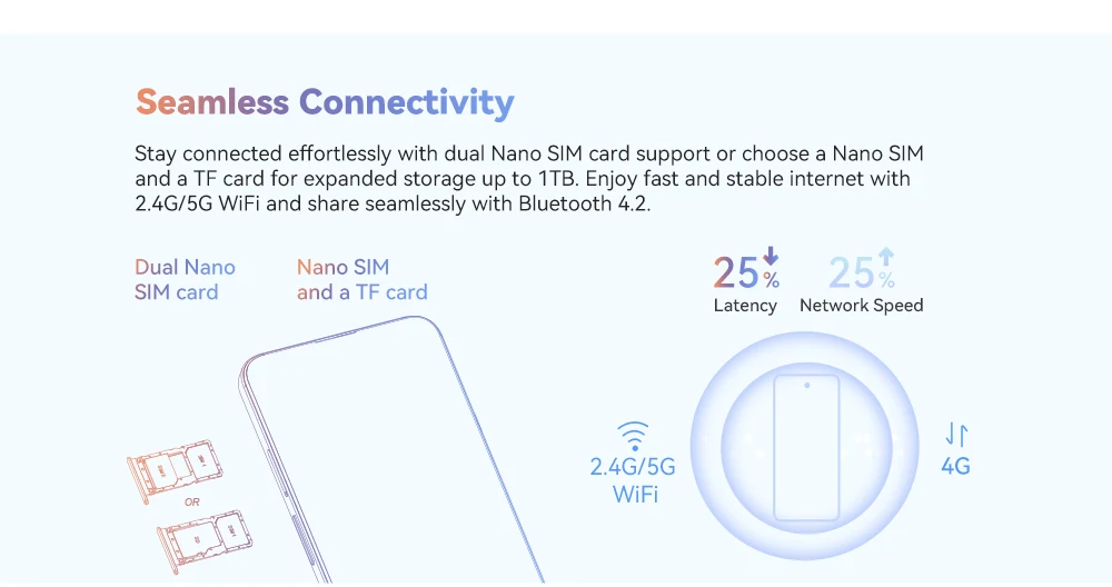 Manténgase conectado sin esfuerzo con la compatibilidad con tarjeta Nano SIM dual o elija una tarjeta Nano SIM y una tarjeta TF para un almacenamiento ampliado de hasta 1 TB.Disfrute de una Internet rápida y estable con WiFi 2,4G/5G y compártalo sin problemas con Bluetooth 4.2.