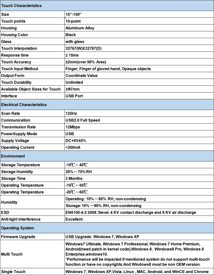 Especificación para 21,5 pulgadas relación 16:9 10 puntos IR multi pantalla táctil: