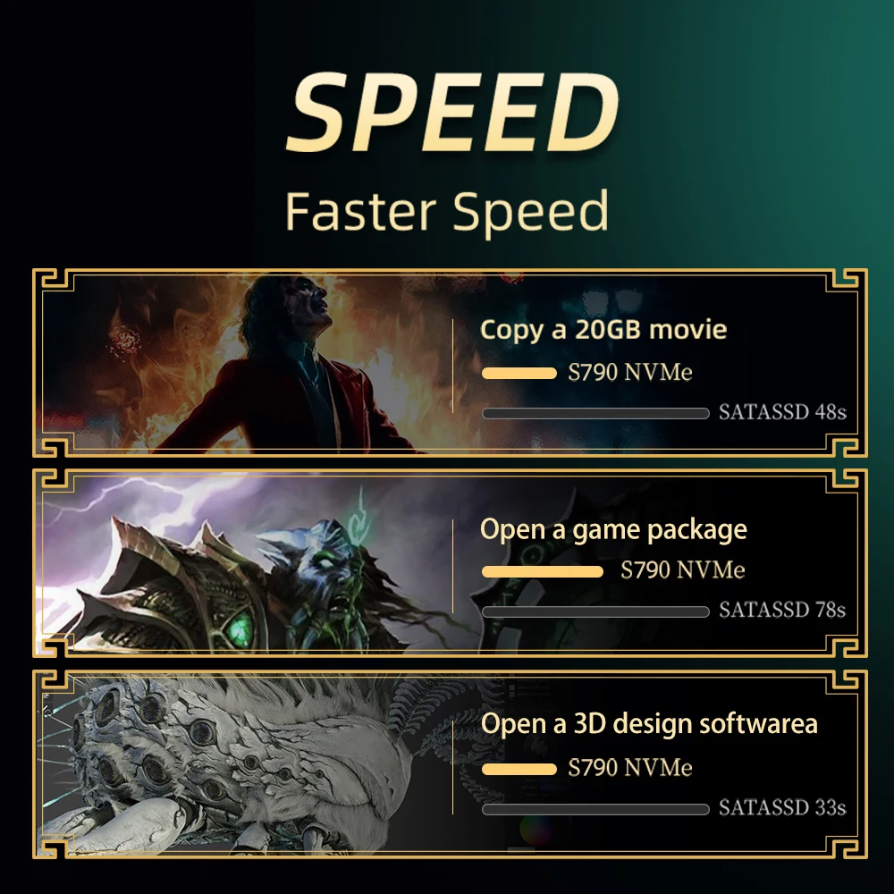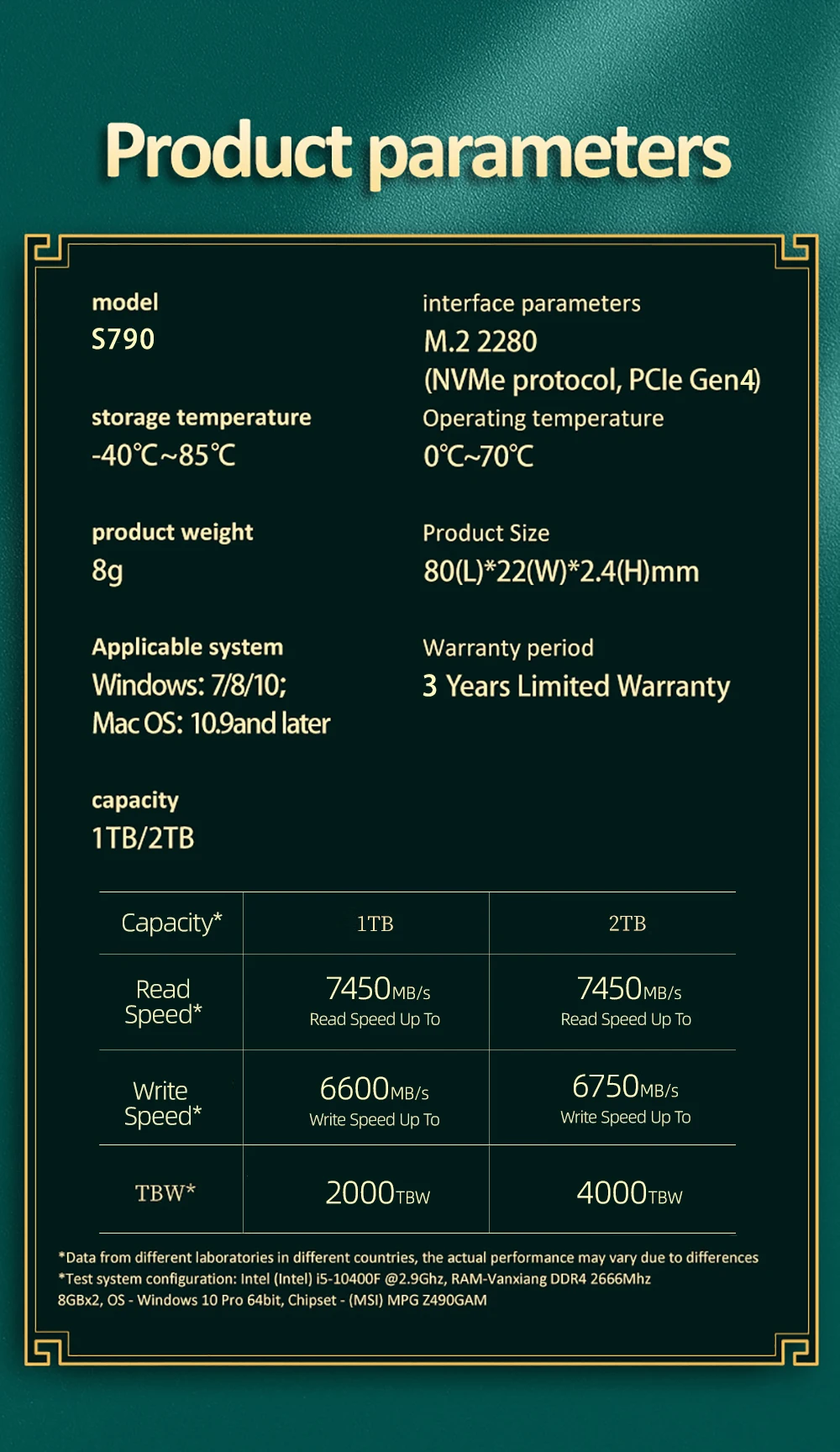 S790-2TB: Velocidad de lectura secuencial de hasta 7450 MB/s; Velocidad de escritura de hasta 6750 MB/s. Máximo a 4000 TBW