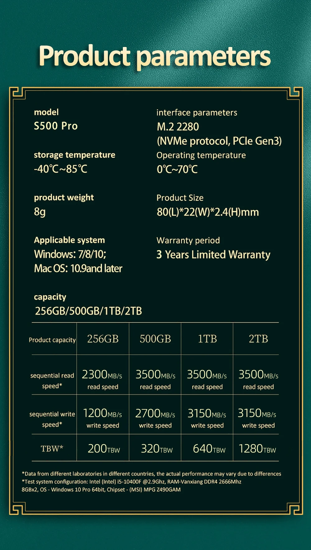 S500 Pro-512GB: Velocidad de lectura secuencial de hasta 3500 MB/s; Velocidad de escritura de hasta 2700 MB/s. Máx. Hasta 320 TBW